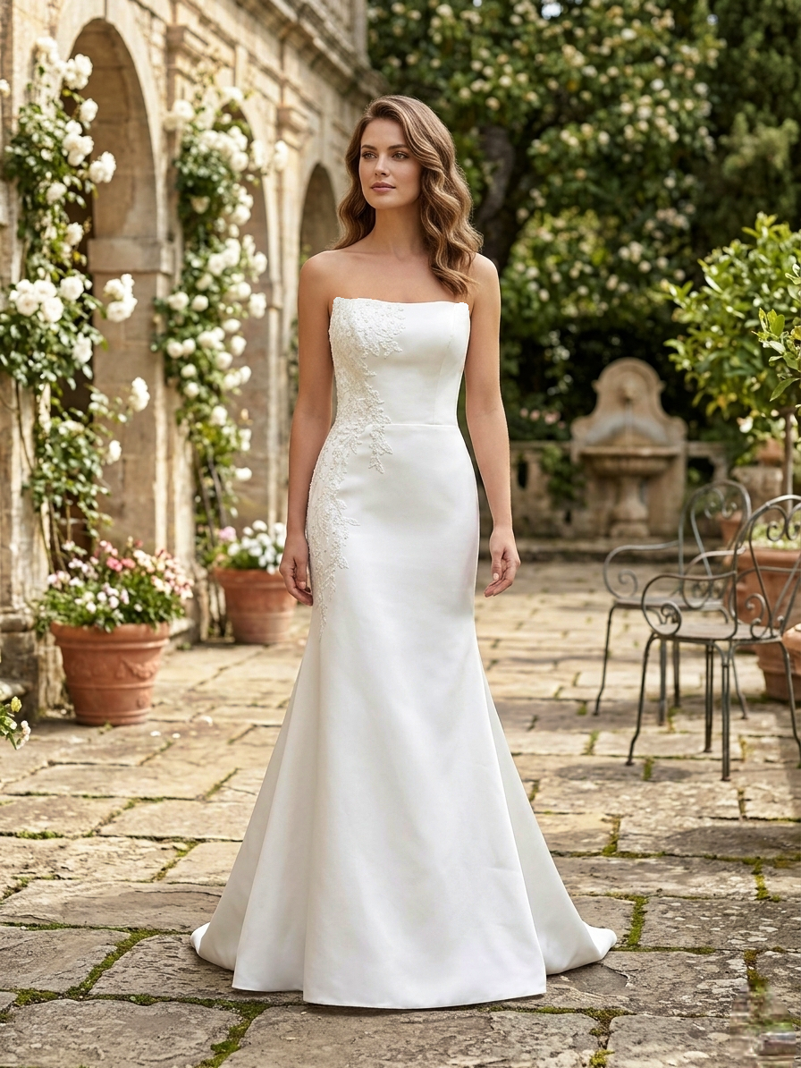 A ruha alapja egy gyönyörű, pánt nélküli, egyenes szabású felsőrész, amely tisztaságot és modern eleganciát sugároz. A felsőrész oldalán és a csípővonalon végigfutó, finom indás csipke hímzés aszimmetrikus díszítése megtöri a szatén minimalizmusát, és romantikus textúrát ad a ruhának.