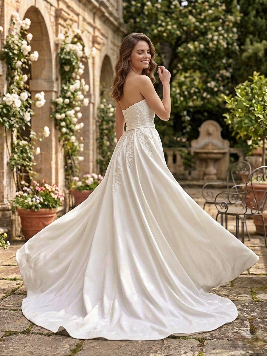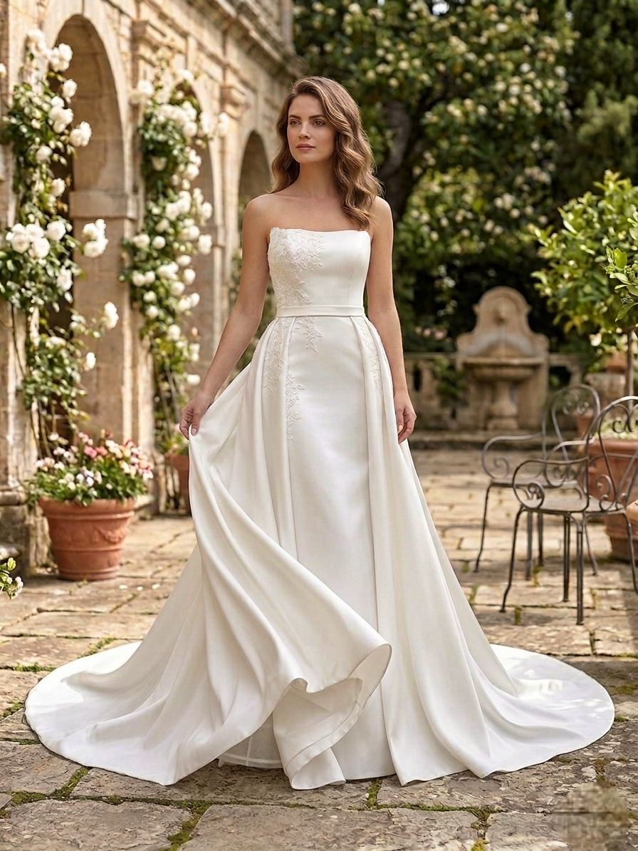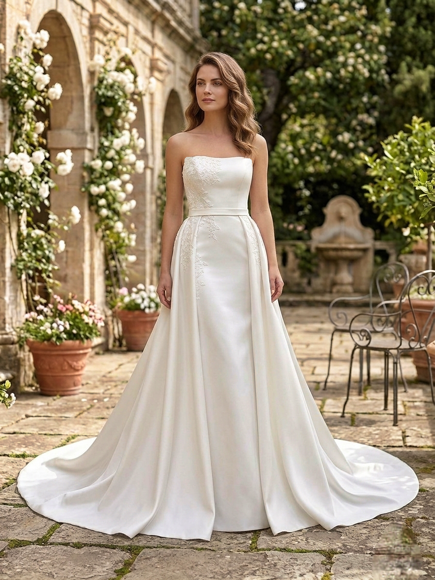 2 az 1-ben Szatén Esküvői Ruha – Levehető Uszállyal és Csipke Díszítéssel