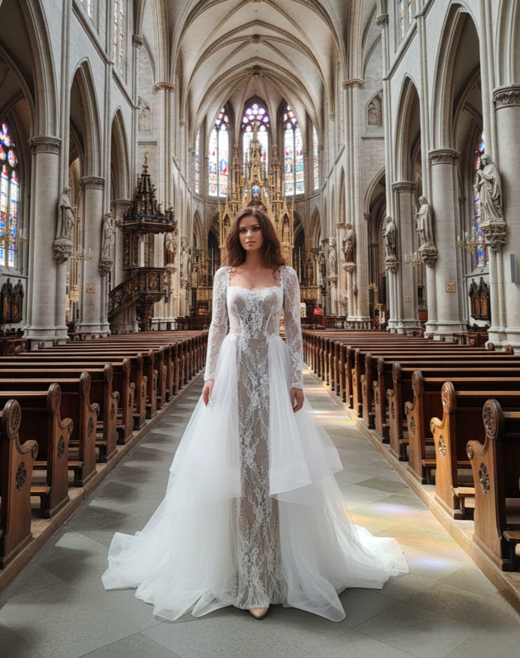 Kombinált sziluett: A ruha alapja egy testhezálló, oszlop fazonú csipkeruha, amelyre egy extra volumenű tüll réteget helyeztek.