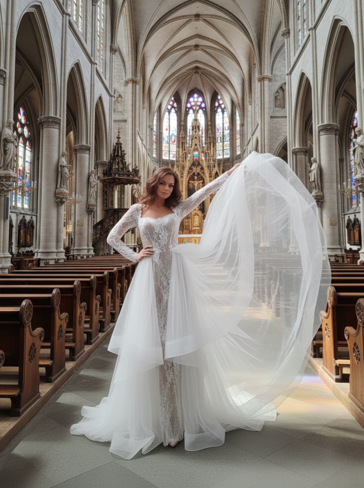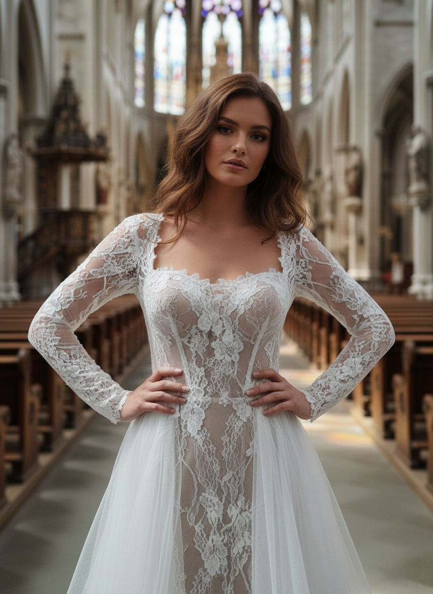 Hosszú ujjú kialakítás: A ruha teljes hosszúságú, szűkített ujjakkal rendelkezik, amelyek végig áttetsző csipkéből készültek.