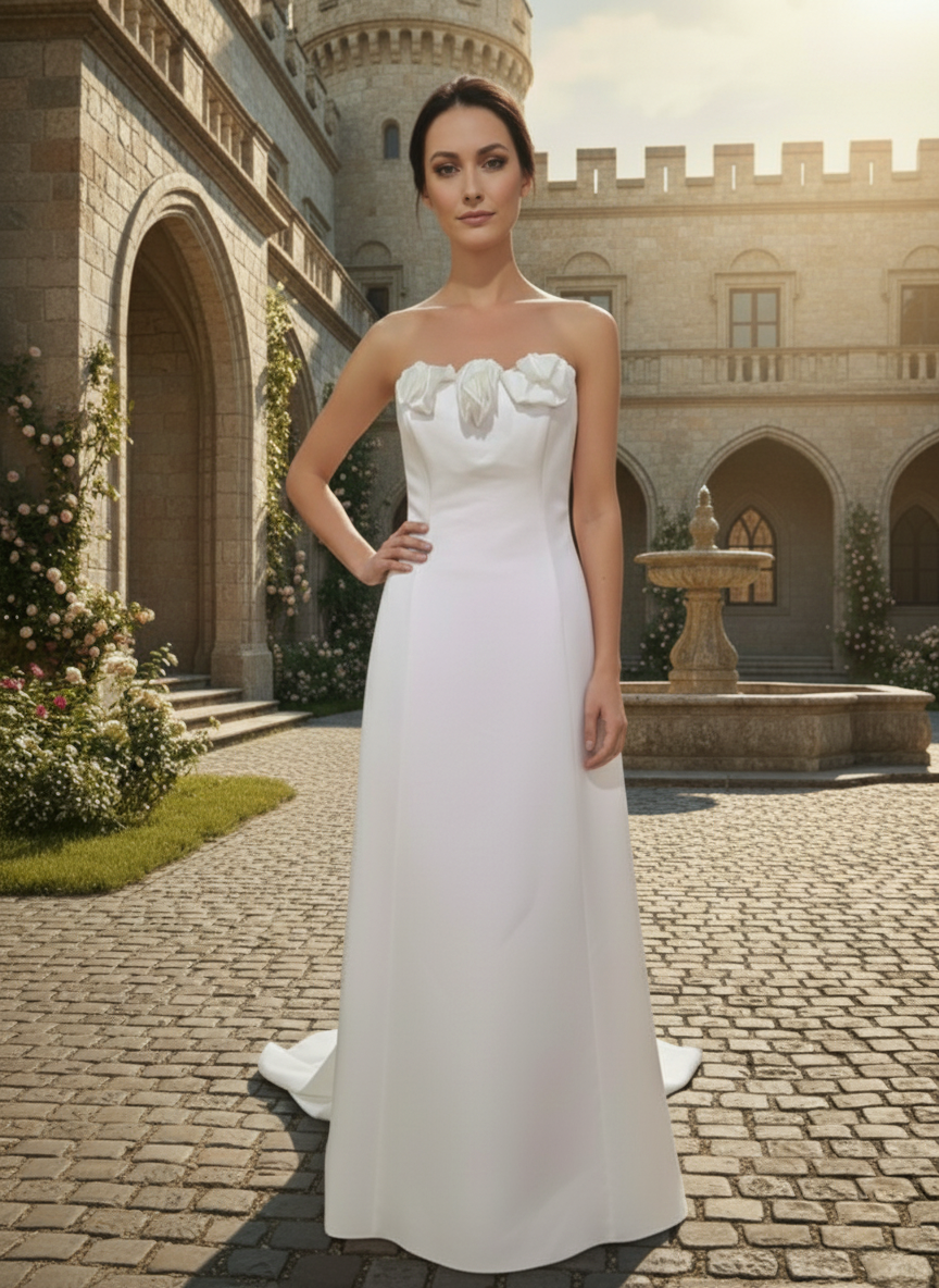 A 3D virágos szatén menyasszonyi ruha romantikus és luxus hatású, amely a klasszikus szatén eleganciát ötvözi a modern, látványos díszítéssel.