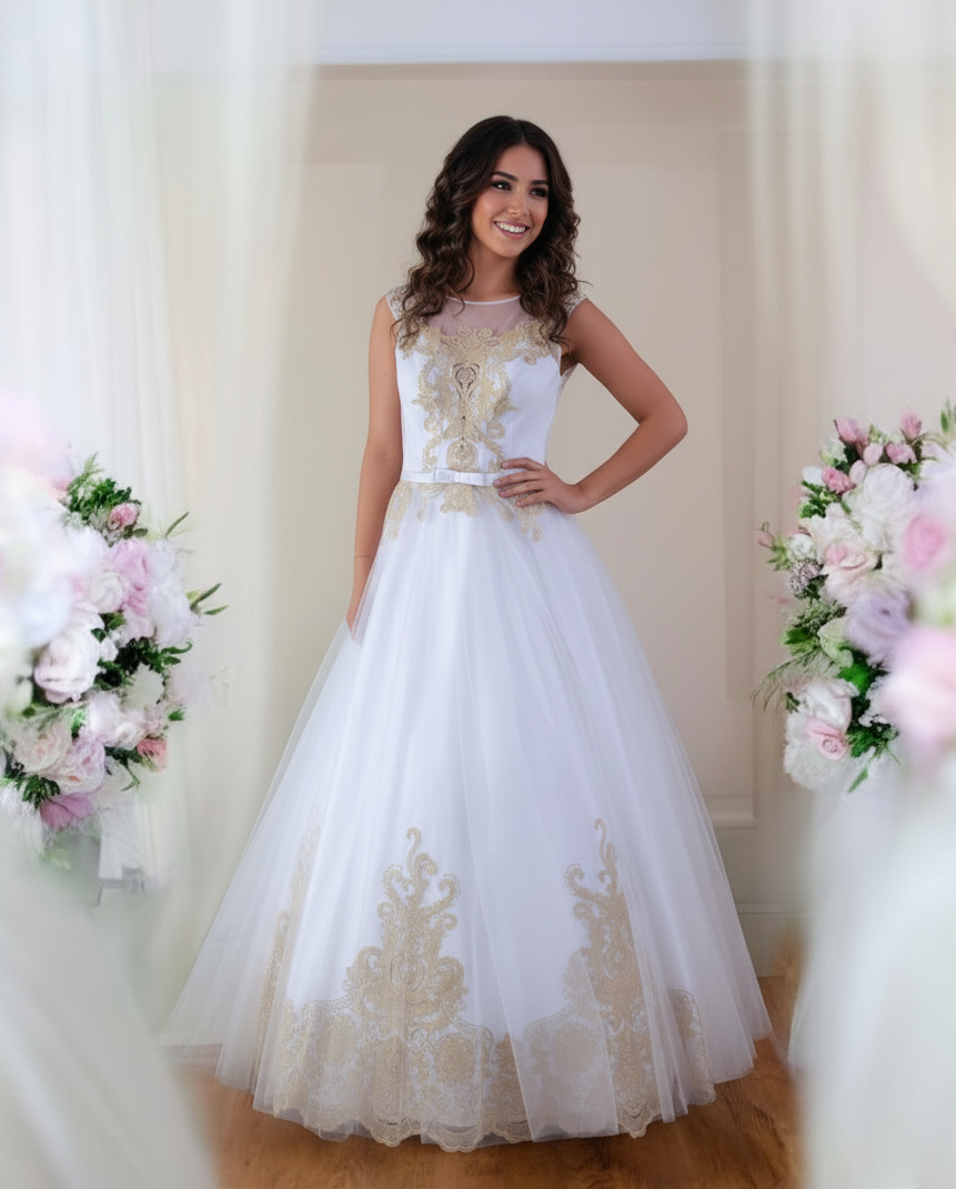 Arany mintás fehér menyasszonyi ruha. Különleges hófehér, tüll anyagú ruhánkban igazi hercegnőként tündökölhetsz!