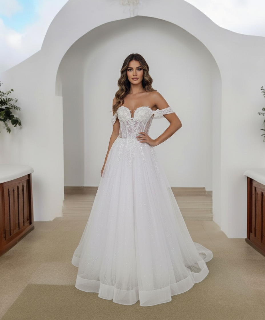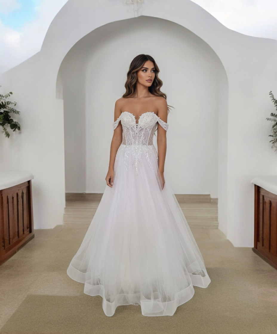 Egy csillámló tört fehér ejtett vállas esküvői ruha különleges és lenyűgöző választás az esküvődre. Az ilyen ruha modern és romantikus elemeket ötvöz, így garantáltan elbűvölő megjelenést biztosít.