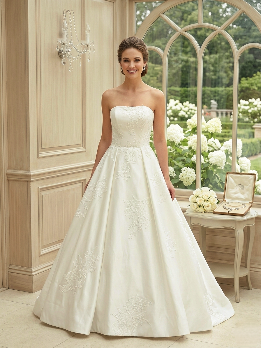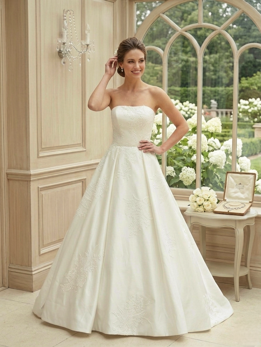 Ez a pánt nélküli, mikádó selyem menyasszonyi ruha a klasszikus királylányos elegancia megtestesítője. Ha olyan ruhát keresel, amely időtlen, nemes és fenséges, ez a modell garantáltan levesz a lábadról.
