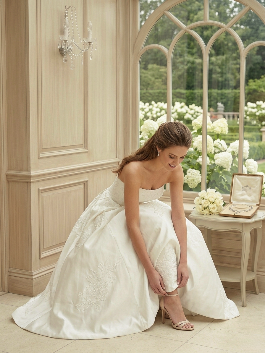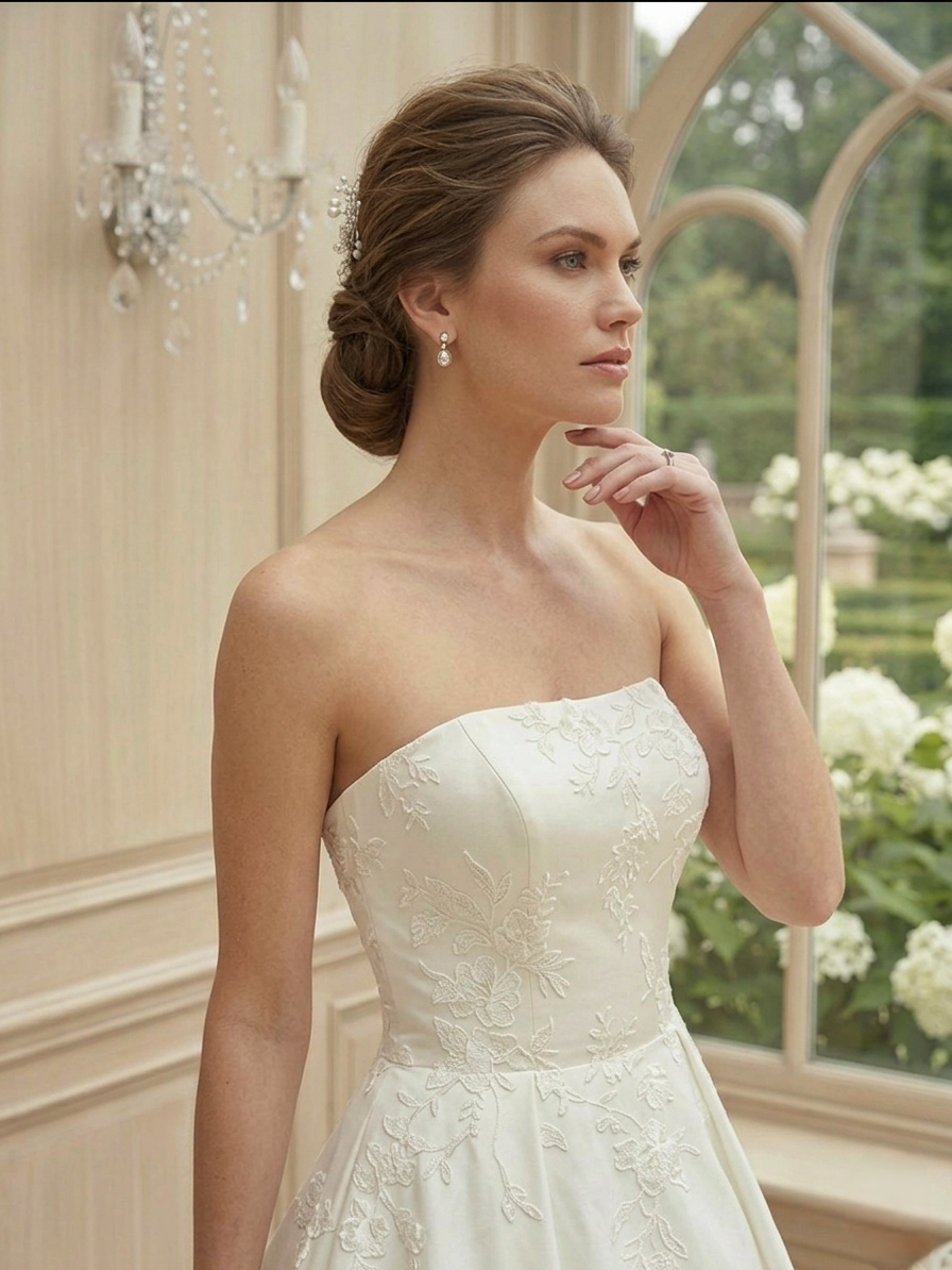Mivel a ruha pánt nélküli, egy elegáns, feltűzött konty és egy pár lógós fülbevaló remekül érvényesül mellette. Ha még tradicionálisabb hatásra vágysz, párosítsd egy csipkeszegélyes fátyollal!