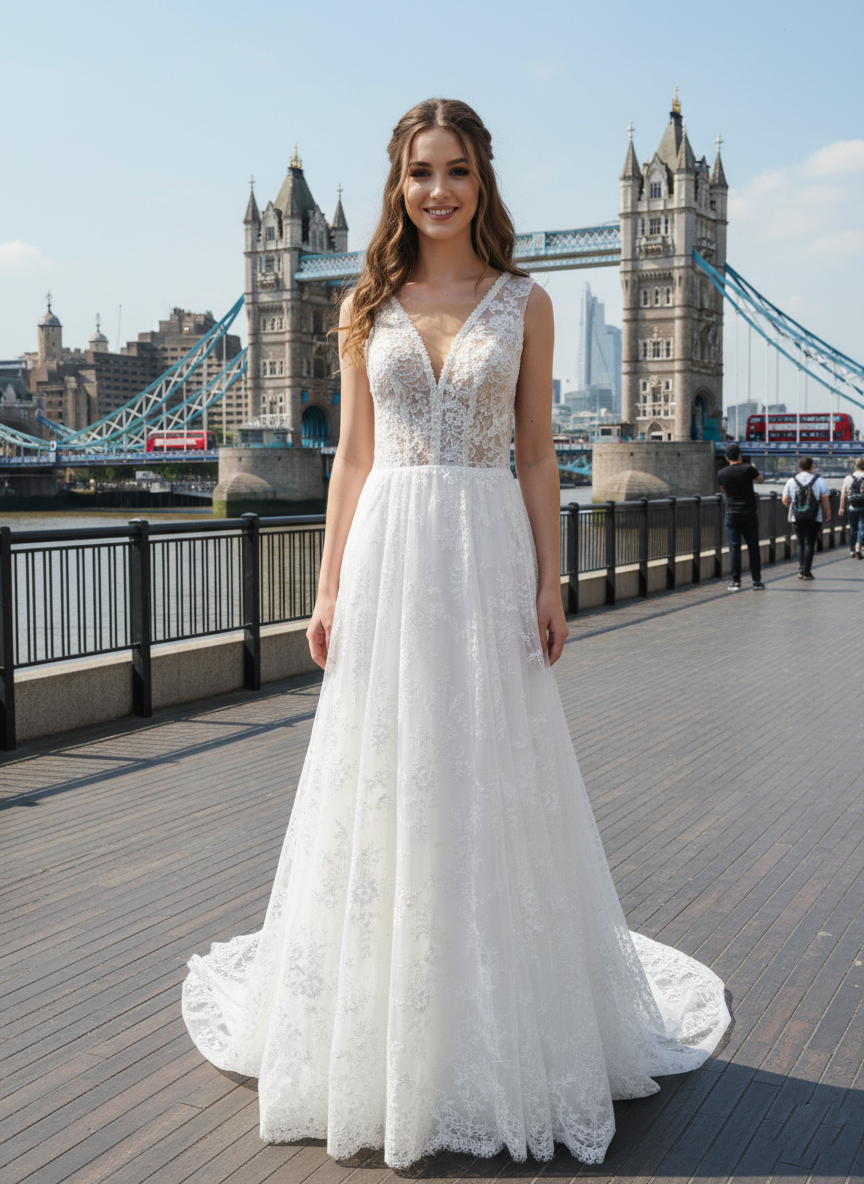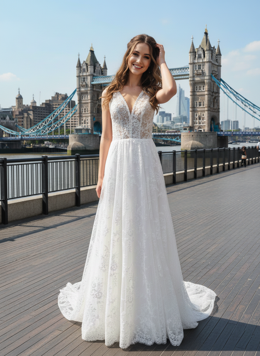 Csodálatos csipke menyasszonyi ruha. Felső része nude alapra építve, így válva szét optikailag az alsó résztől. Vállpántos menyasszonyi ruha, a biztos tartás érdekében. Nem mélyen dekoltált, de dekoltázs részénél illúzió tüll betét található. Hátul rejtett cipzárral ellátva, mérete 36-38-as méretig alakítható.