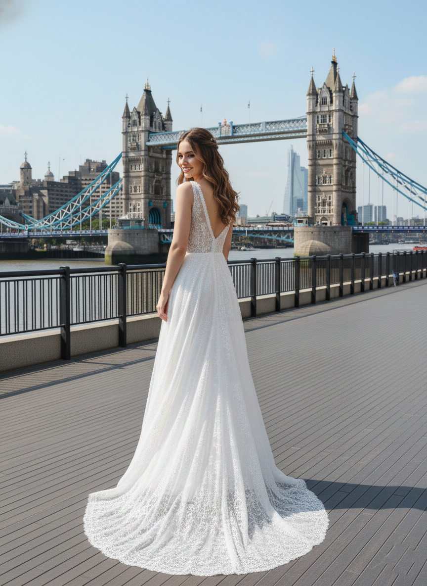 Alsó része hófehér tüllre épített sűrű csillogó csipkével ellátott uszályban végződik. Mely uszály gyönyörű eleme a szertartásnak, és a fotózásnak, és bármikor felcsatolható.