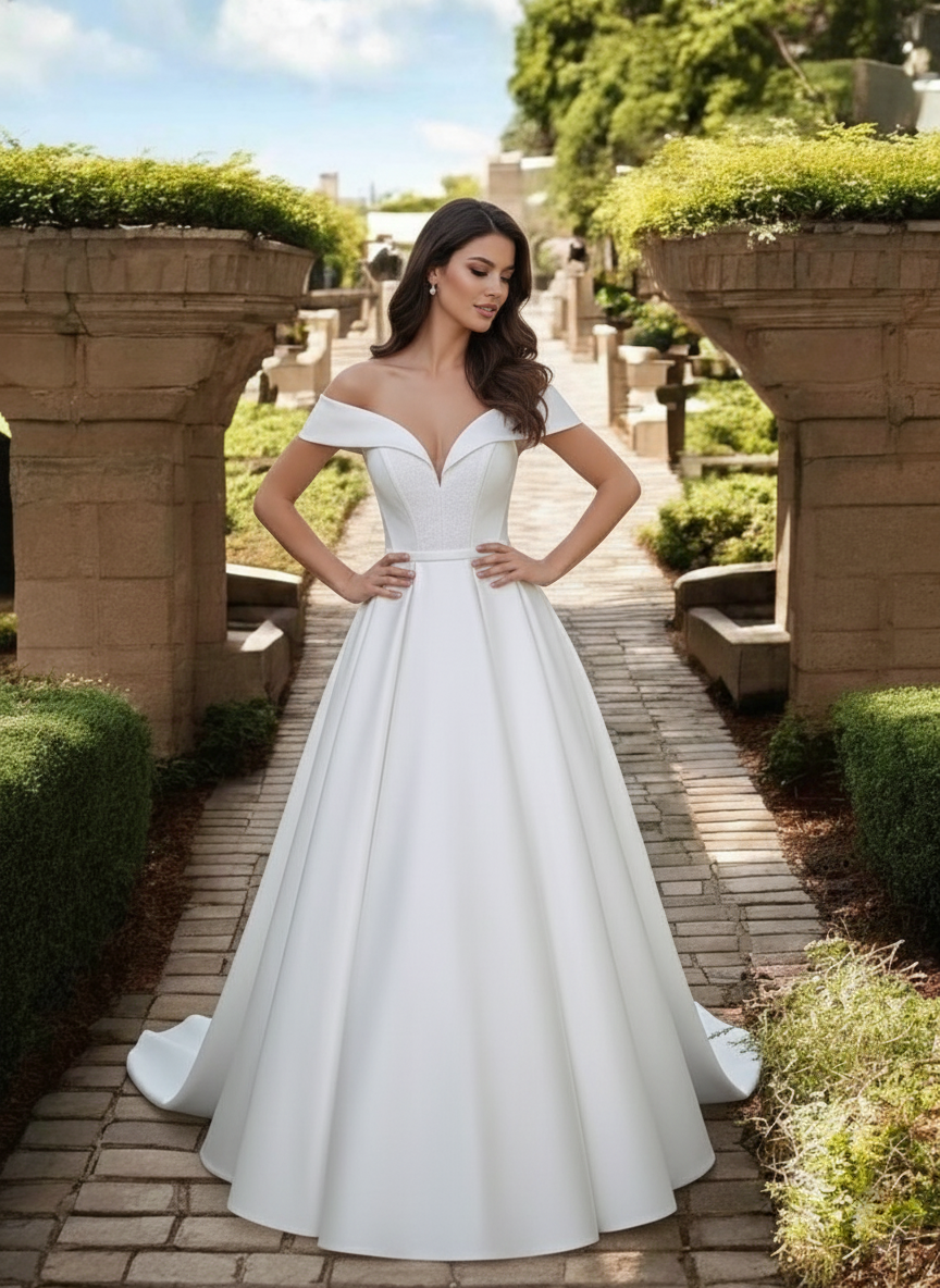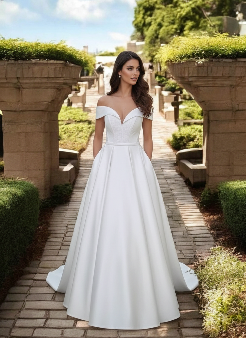 Egy ejtett vállas, csillámló szatén menyasszonyi ruha elegáns és kifinomult választás. A szatén fényes, sima textúrája alapból luxus hatást kelt, a csillámló részletek pedig extra ragyogást adnak, különösen gyertyafényben vagy esti rendezvényen.