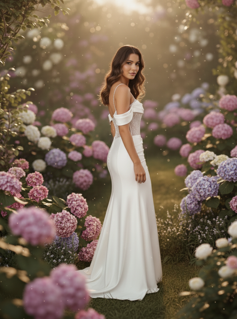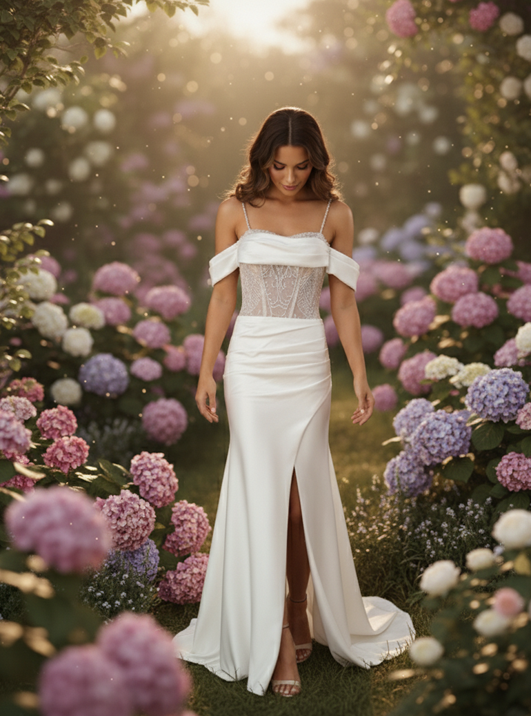 Ejtett vállas hasított menyasszonyi ruha. Felső része spagetti pántos, mely biztos tartást nyújt viselőének. Ejtett vállai gyönyörűen emelik ki a vállakat és a nyakat. Derék része míderrel ellátott, áttetsző illúzió tüllre épített csipke díszítéses. Alsó része szatén anyagú, hasított szoknya részt kapott. Igazán nőies és elegáns menyasszonyi ruha.
