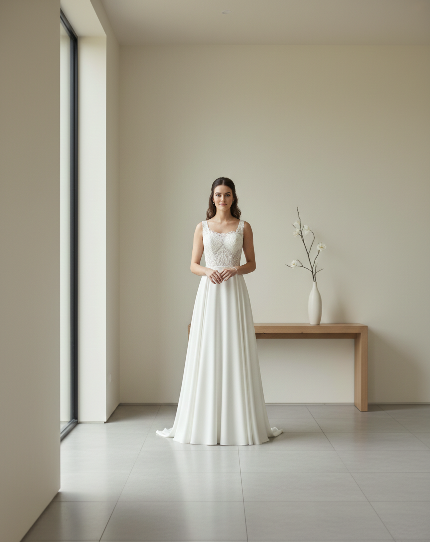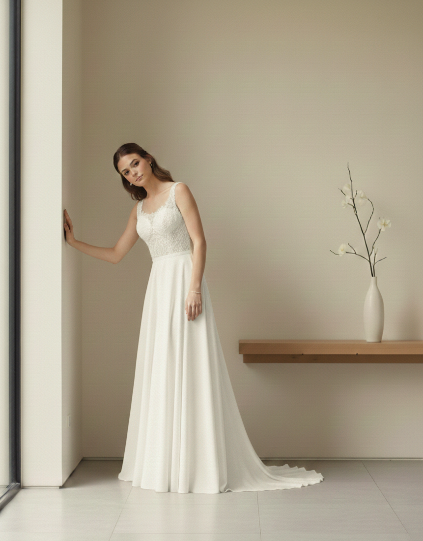 Jennie nevű menyasszonyi ruhánk a klasszikus elegancia és a modern minimalizmus tökéletes ötvözete. Elegáns és letisztult esküvői ruha. Kifinomult megjelenését a két különböző anyagtípus harmonikus párosítása adja.