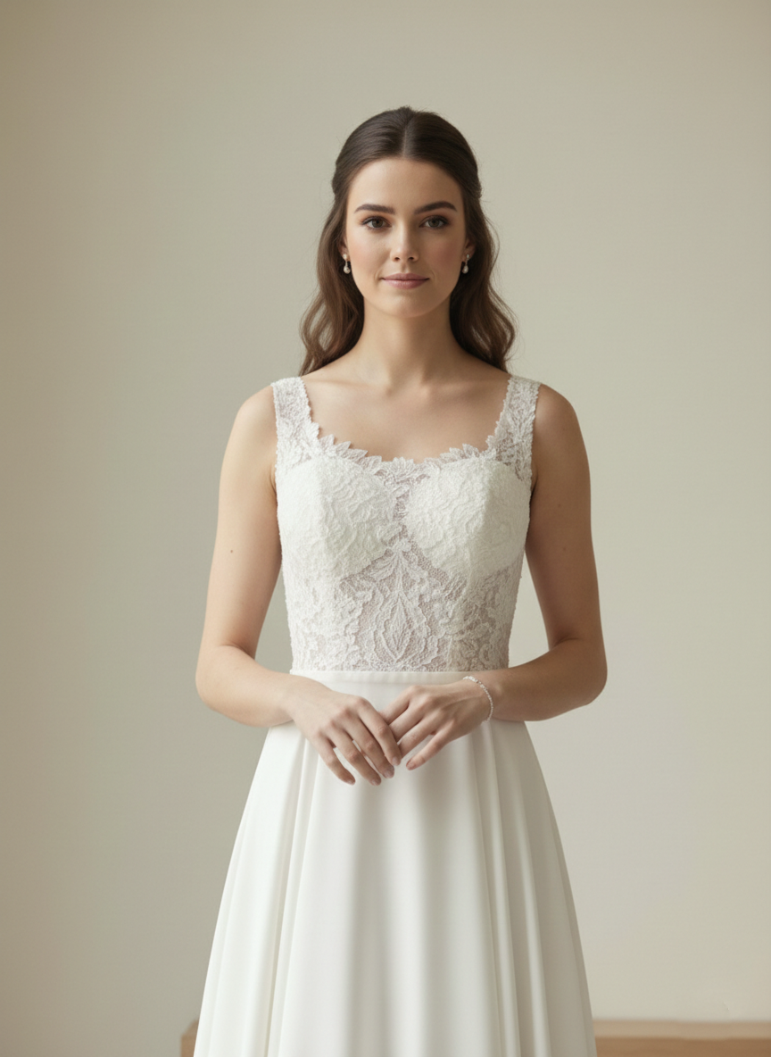 Nyakvonal: Finoman ívelt szögletes (csipkézett szélű) nyakkivágás, amely elegánsan keretezi a dekoltázst.