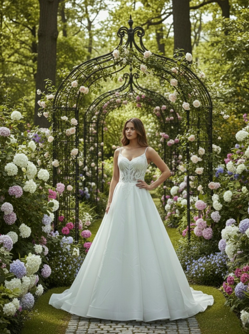 A ruha a modern és a hagyományos stílus ötvözete: a felsőrész részletgazdagsága adja a dekoratív elemet, míg a letisztult szoknya a klasszikus eleganciát képviseli.