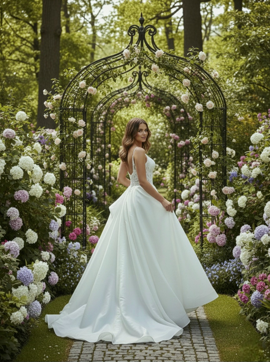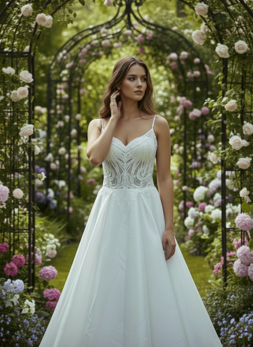 V-nyakkivágás: A dekoltázs lágy V-alakban végződik, vékony, úgynevezett „spagetti” pántokkal kombinálva, ami könnyed és légies hatást kelt.