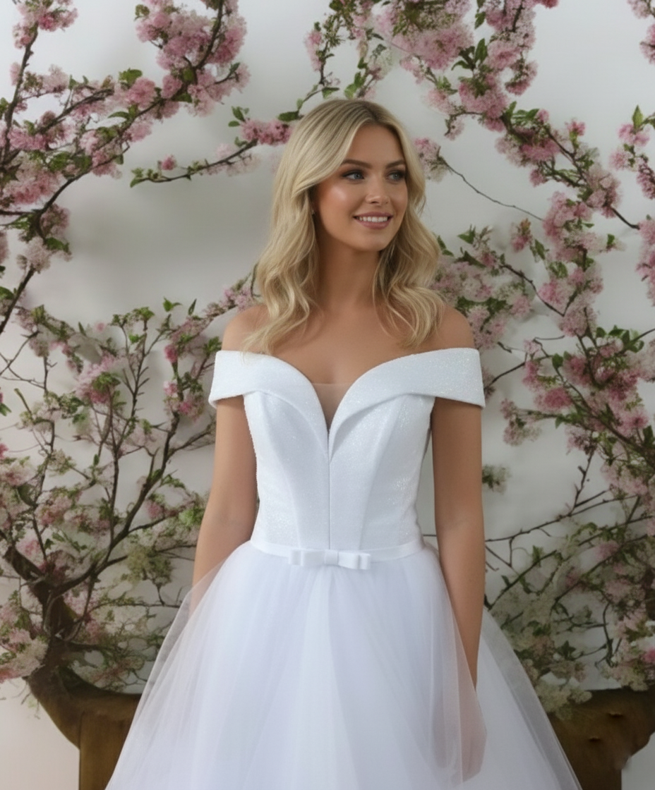 Fehér ejtett vállas csillámló fodros menyasszonyi ruha, mely csodálatosan elegáns és nőies esküvői ruha. Kiváló választás lehet a nagy napra. Felső része csillámos tüllből készült, mely csillámok a ruha alján lévő fodrokon is visszaköszönnek. A mai divatnak megfelelően az ejtett vállas felsőrész olyan tervezési eleme, amely megmutatja a vállaidat, miközben egyedi és romantikus megjelenést kölcsönöz a ruhának. A fodrok pedig könnyedséget és mozgást adnak a ruha vonalainak.