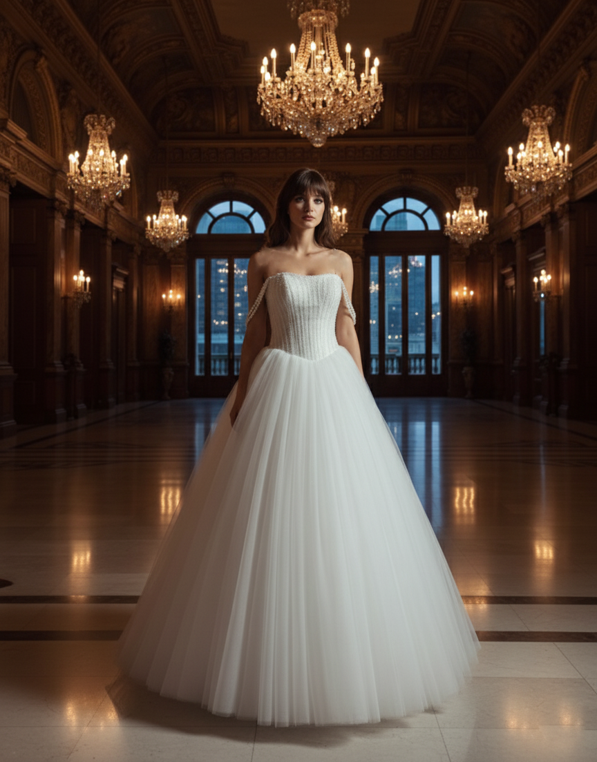 Gyöngyös báli ruha. Varázslatos fehér színű, tüll anyagú Otilia menyasszonyi ruhánkban igazi hercegnőként tündökölhetsz!