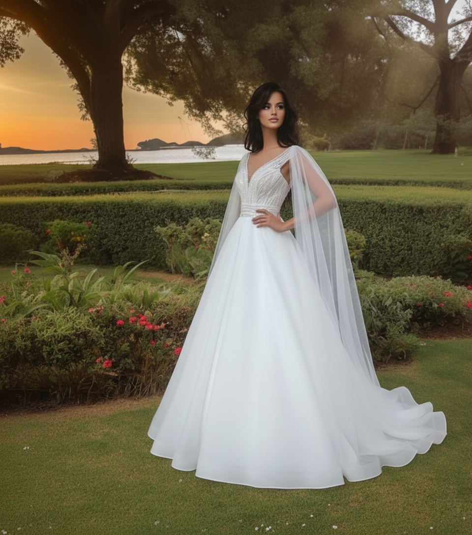 Gyönyörű tejorganzából készült menyasszonyi ruha. A mai trendnek megfelelően bohó tüll vállai lecsatolhatóak, így a bevonulásnál és a fotózásnál is tökéletes kiegészítője a ruhának.
