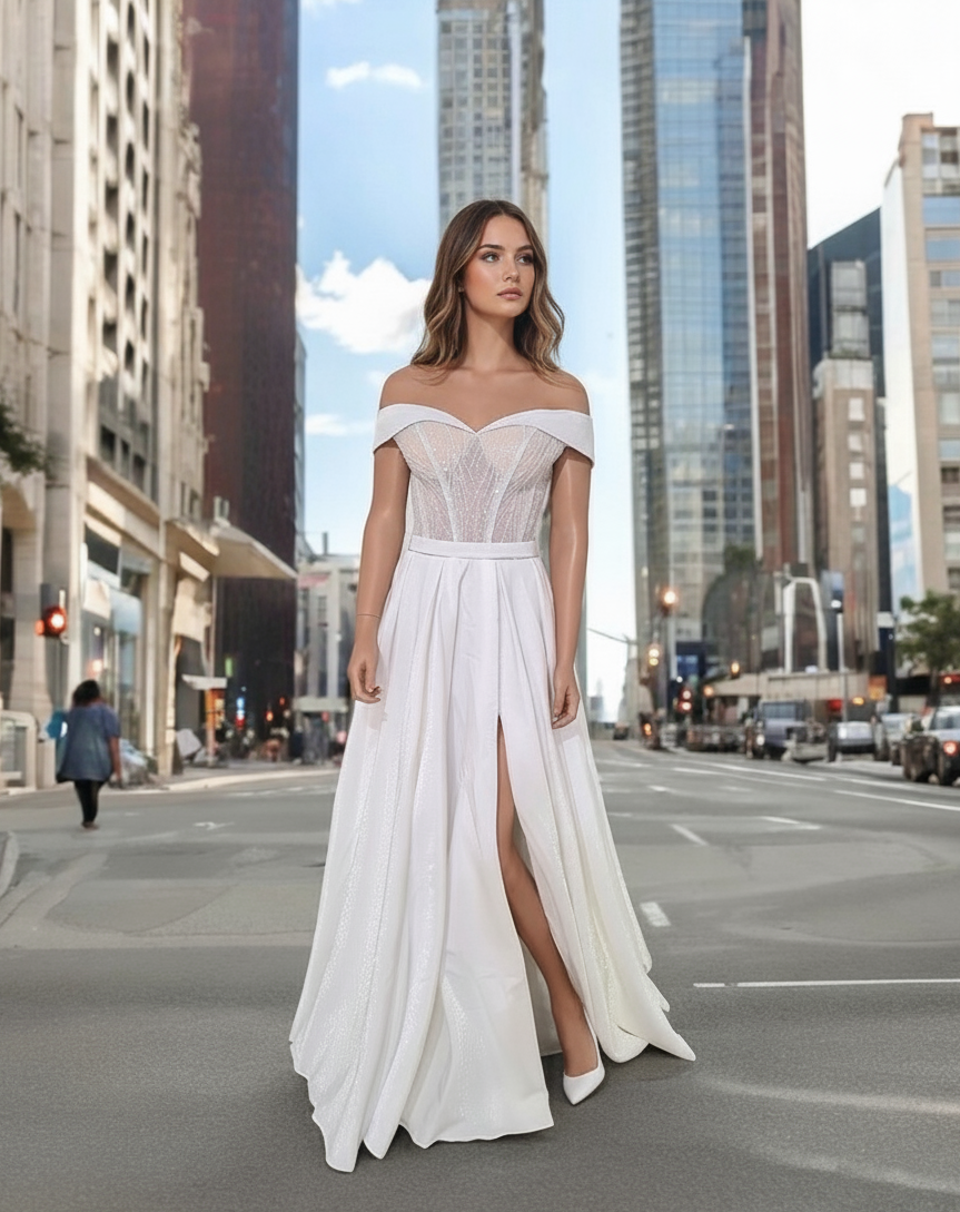 Egy hasított csillámló szatén menyasszonyi ruha különleges és látványos választás lehet az esküvőre. Ez a stílusú ruha ötvözi a modern divatot a hagyományos esküvői eleganciával, és biztosan emlékezetes megjelenést biztosít a nagy napon.