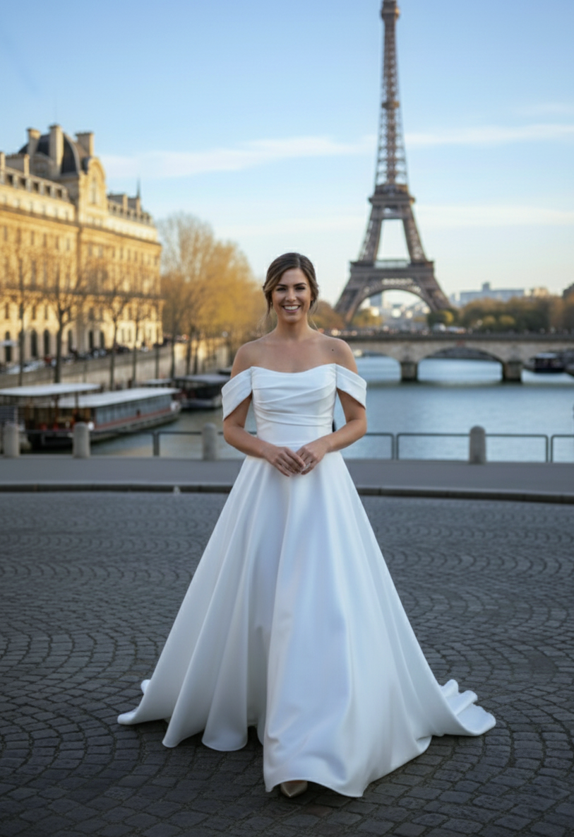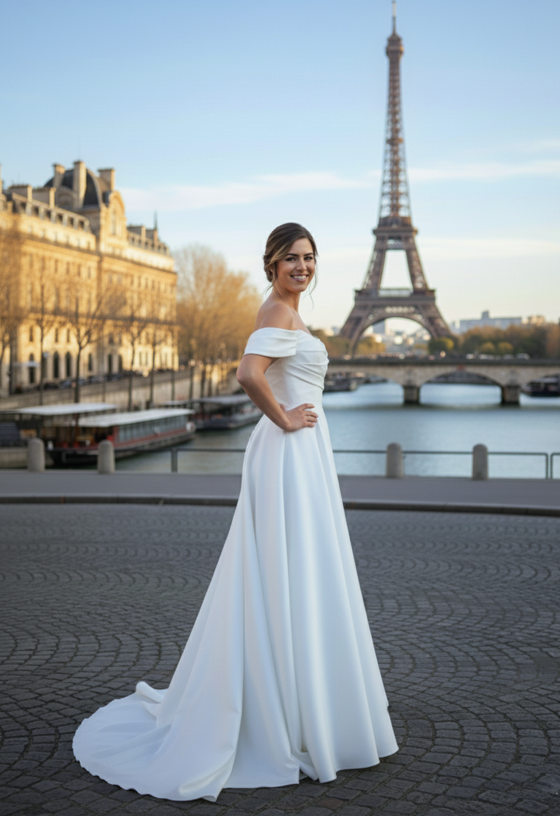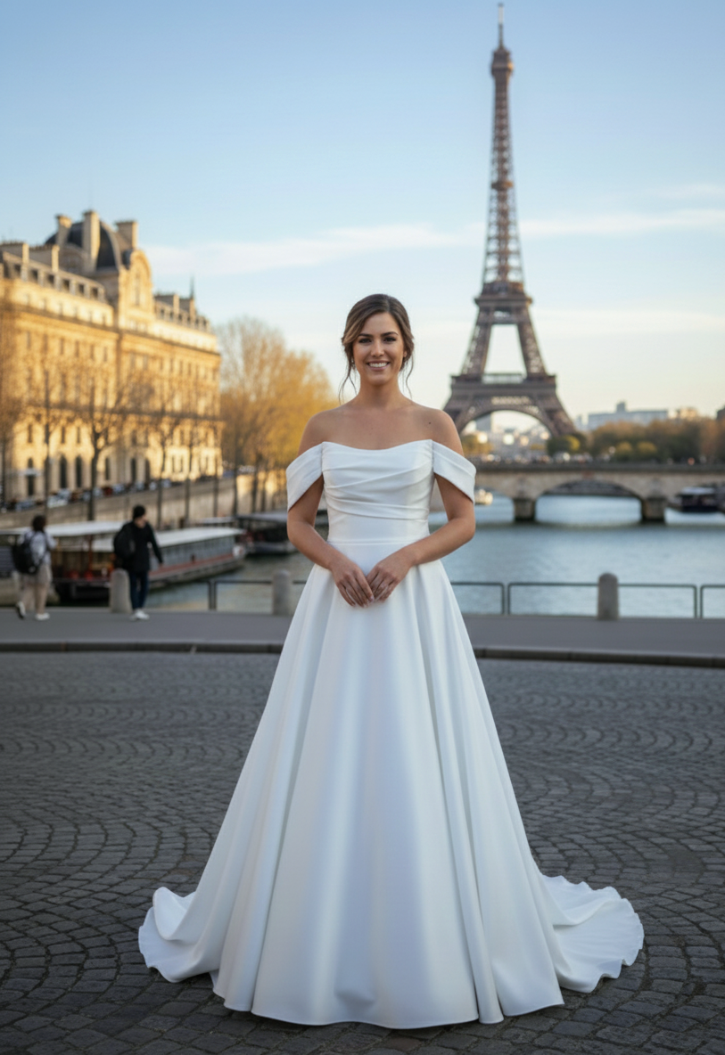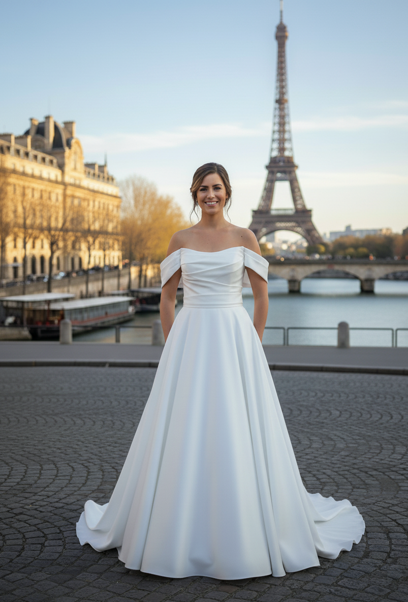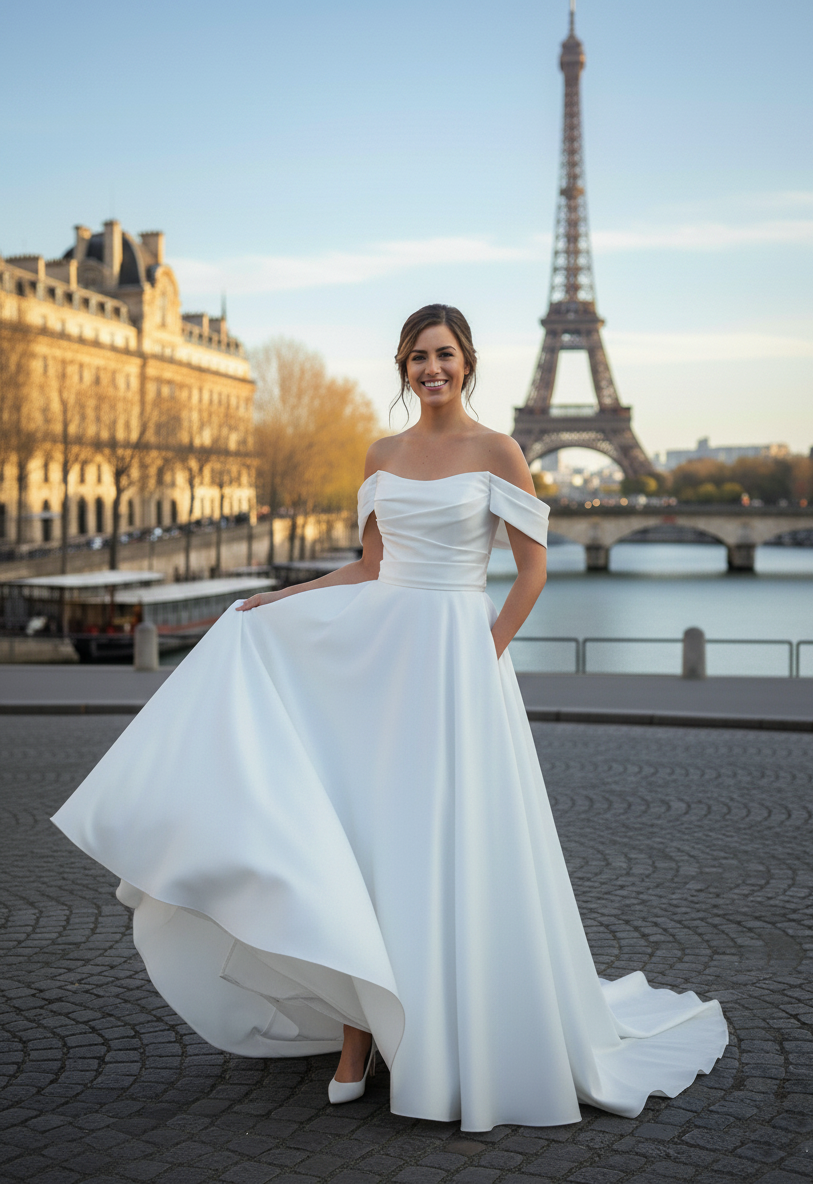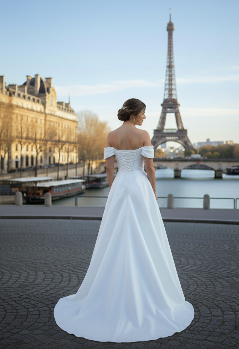 Nyakvonal: Ejtett vállú (off-the-shoulder) kialakítású, ami finoman keretezi az arcot és kiemeli a vállakat.