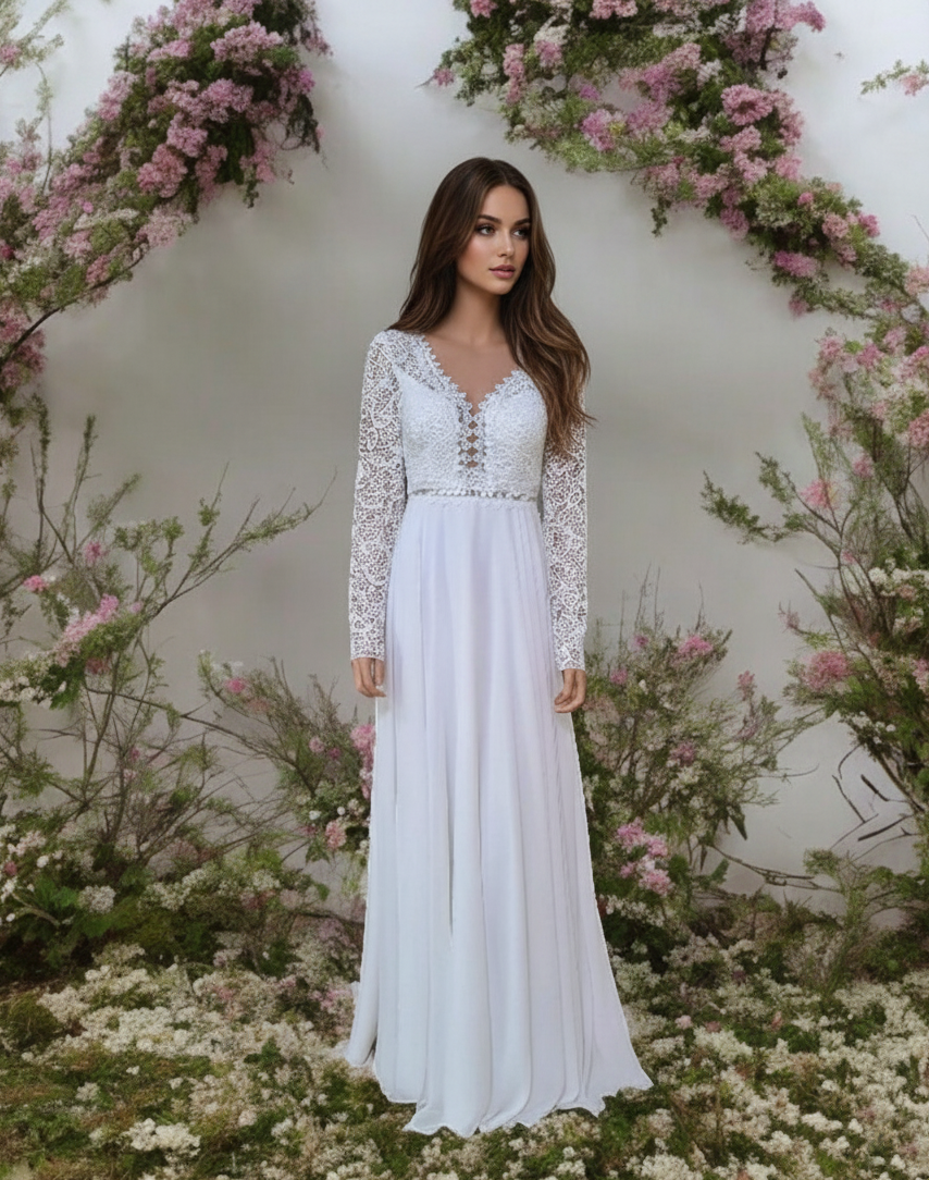 Horgolt csipke ujjas chiffon menyasszonyi ruha.