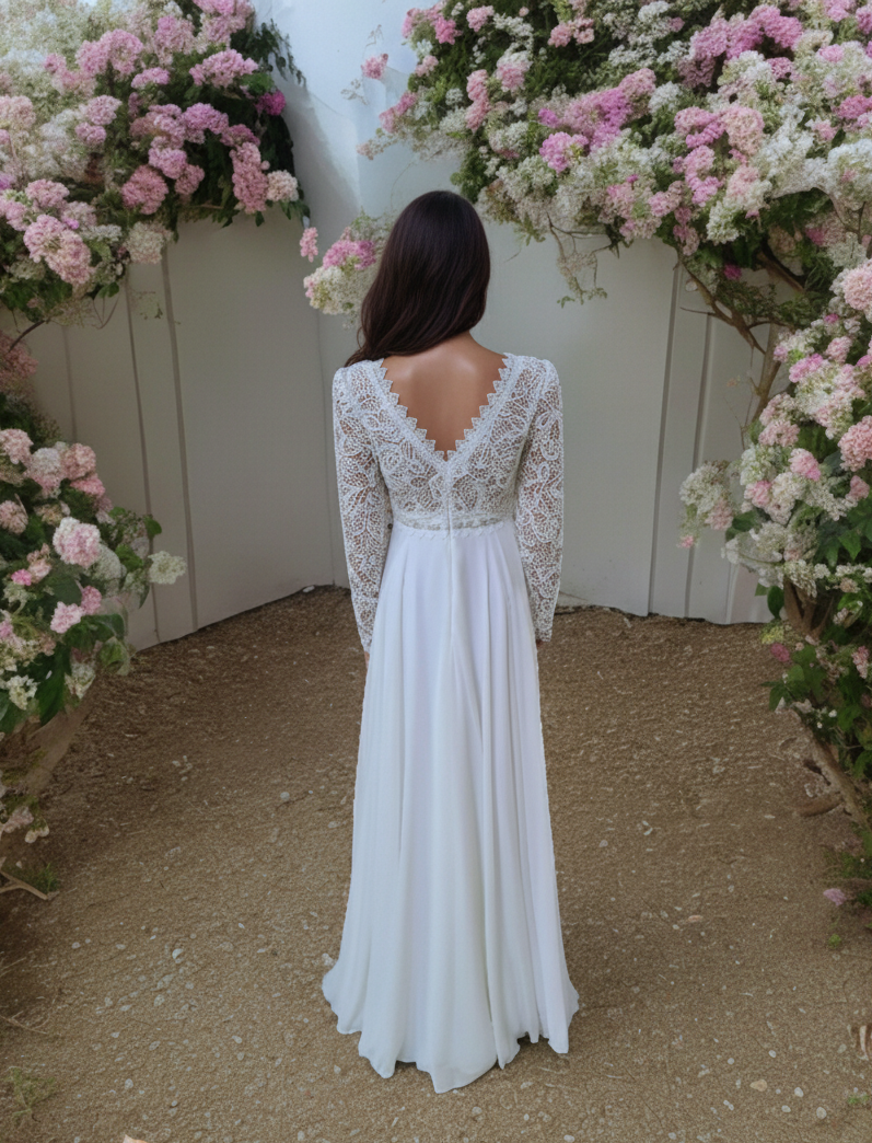 Alsó része lágy eséséű chiffon anyagból készült, mely kisebb, meghittebb szertartásokra, állófogadásokra, tengerparti, vagy vízparti esküvőkre is tökéletes választás.