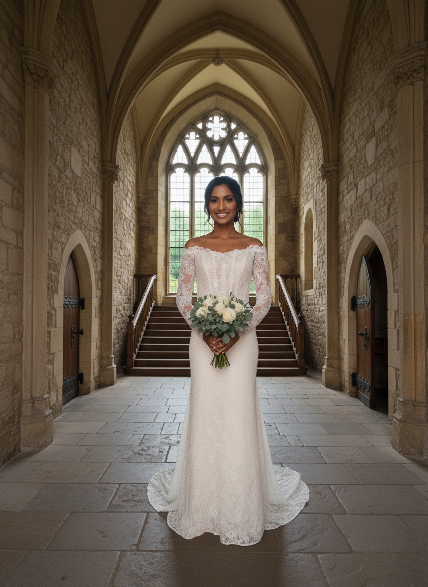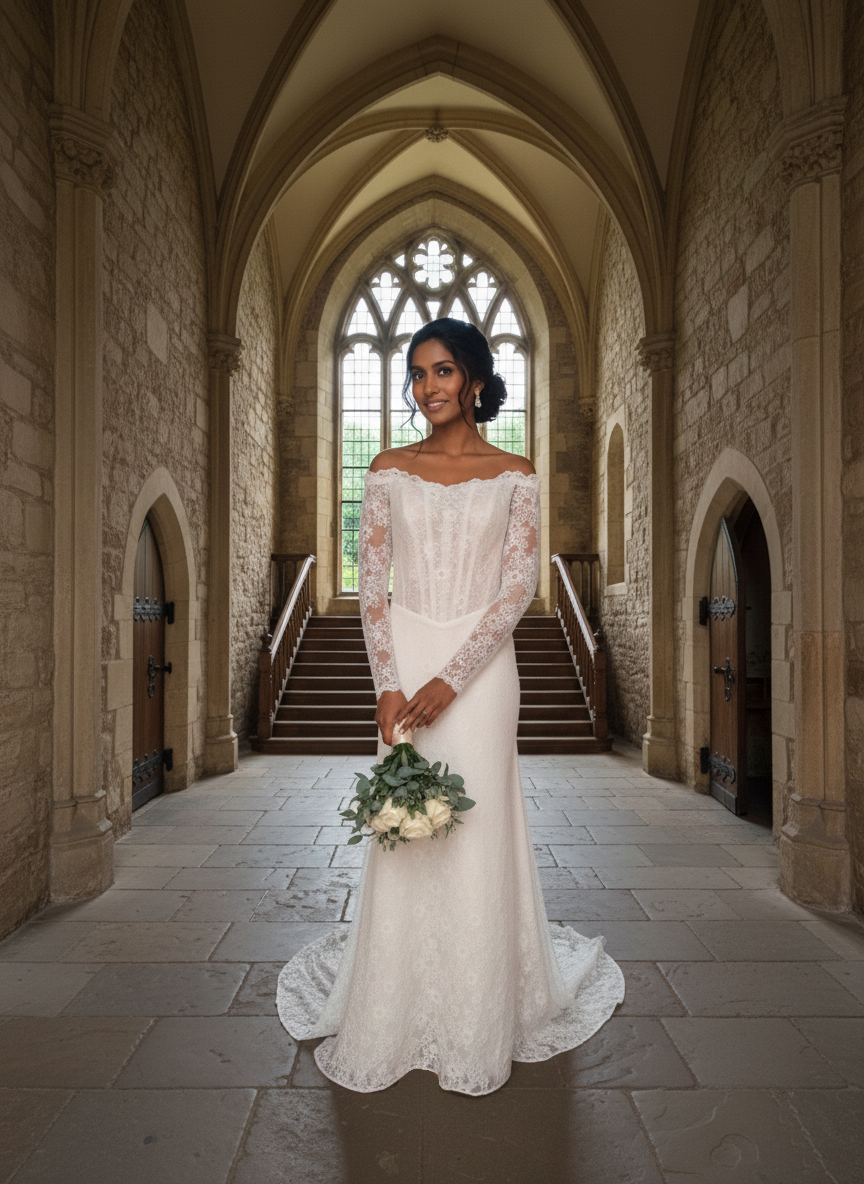 Stílus: időtlen, romantikus és kifinomult, tökéletes választás templomi vagy kastélyesküvőhöz.