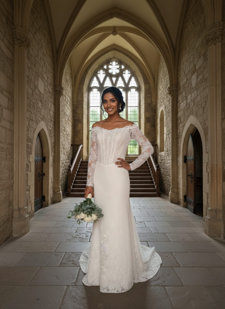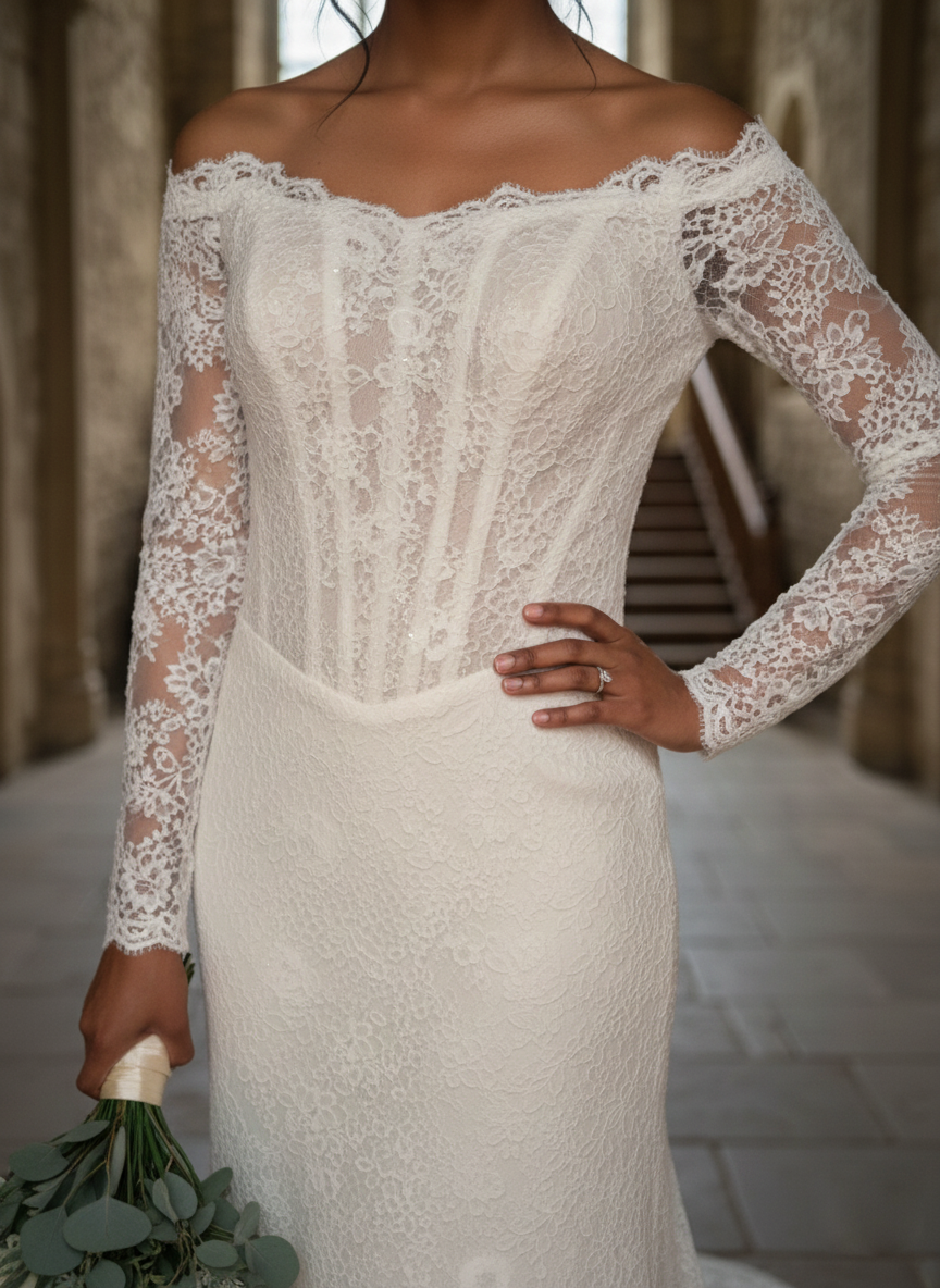 Hosszú ujjú ejtett vállas csipke menyasszonyi ruha, amely klasszikus és elegáns megjelenést sugároz.
