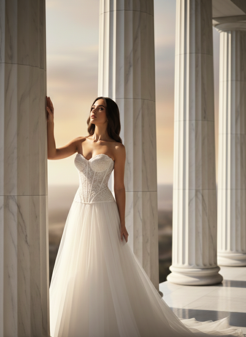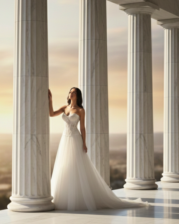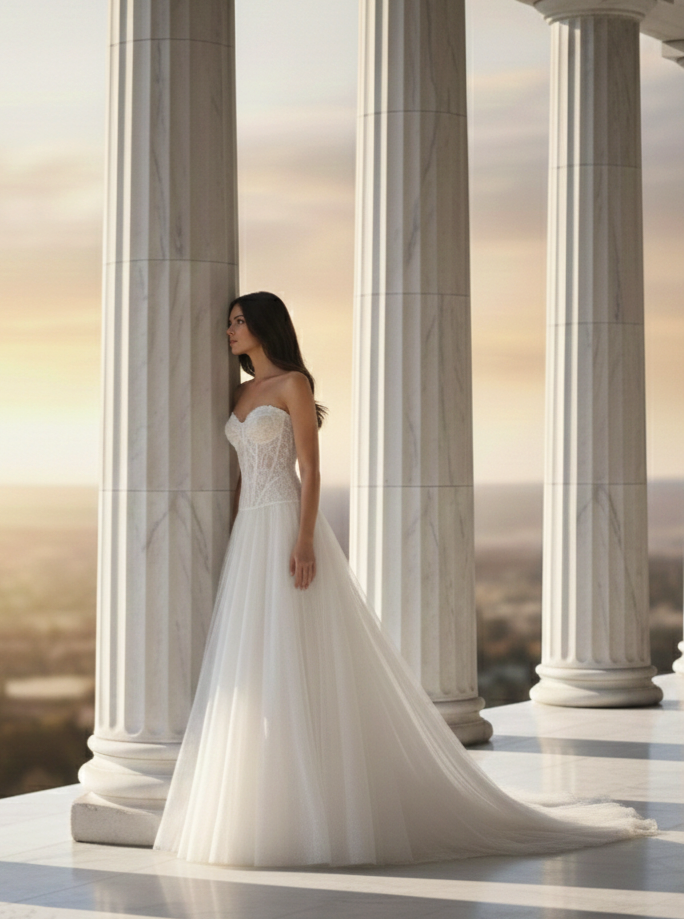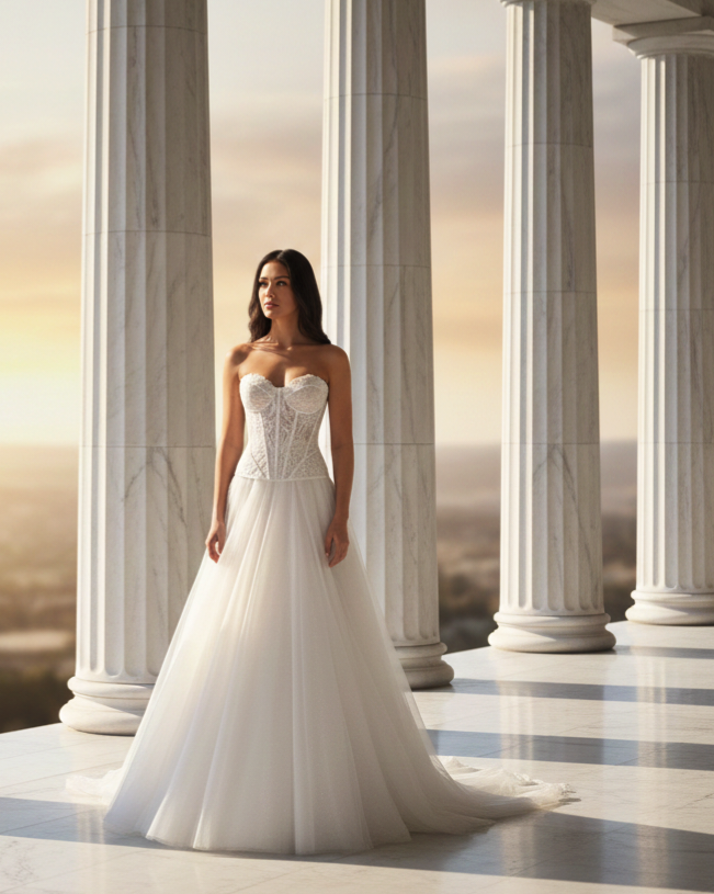 Ez a menyasszonyi ruha a klasszikus hercegnő stílust ötvözi a modern, strukturált elemekkel.