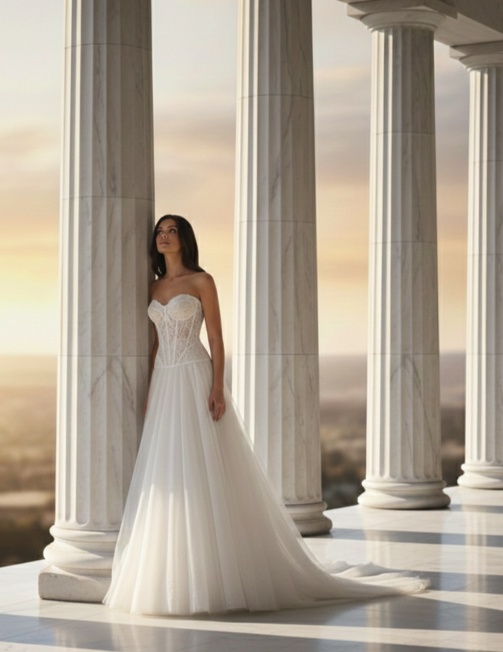 Ez a darab a „modern romantika” képviselője: 2 részes, a fűző strukturáltsága erőt és magabiztosságot sugároz, míg a csillámló lágy tüllszoknya megőrzi az esküvői ruhák álomszerű jellegét.
