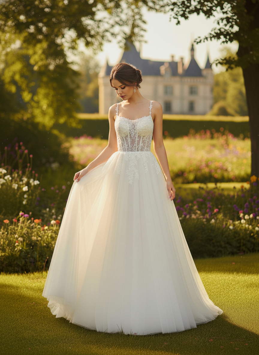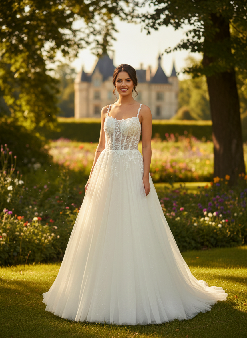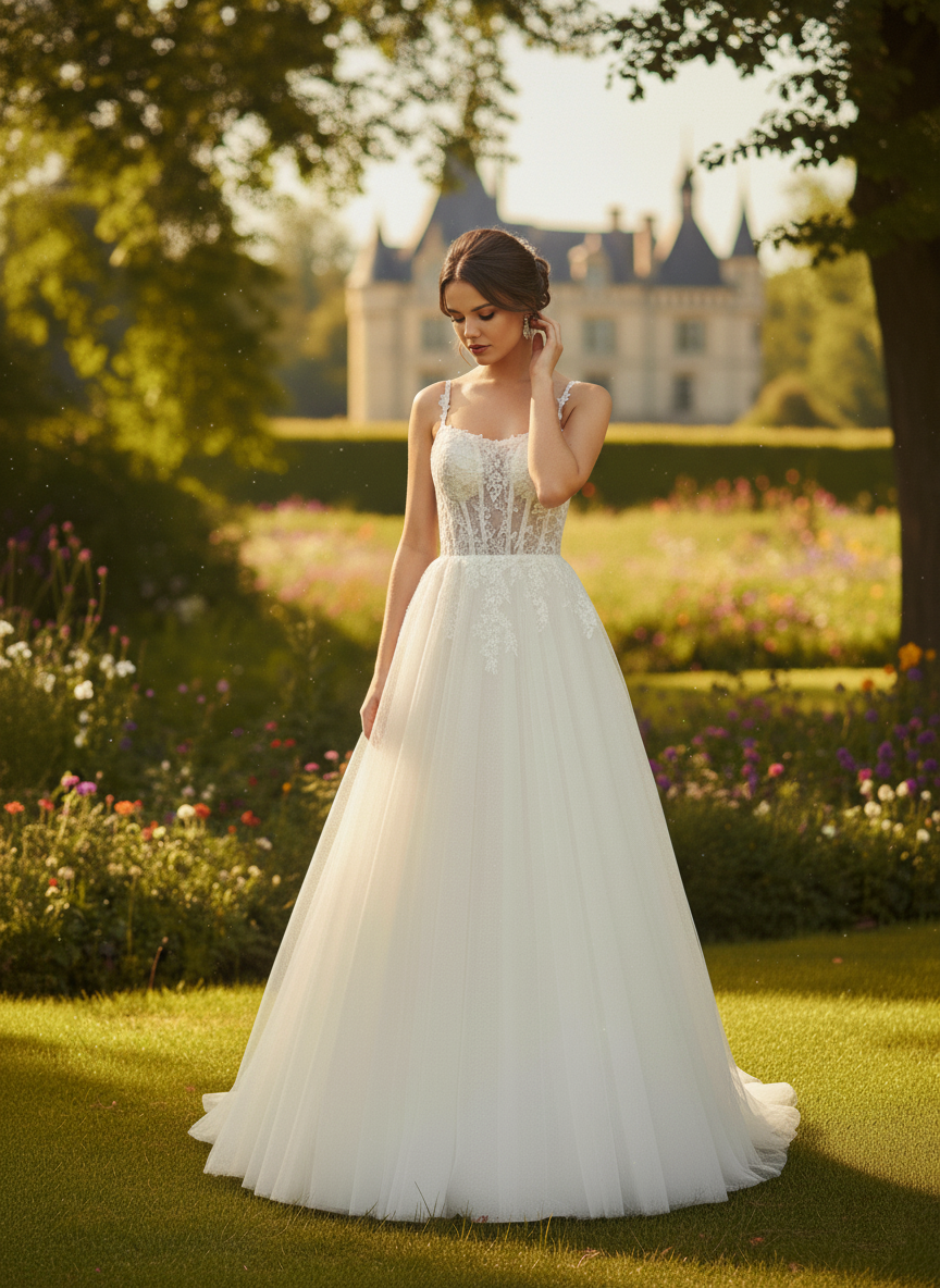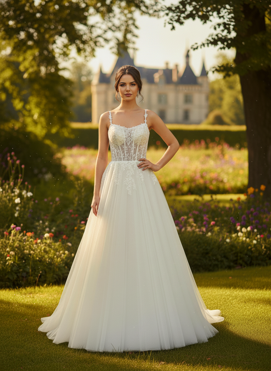 Pántok: vékony, díszített vállpántok, amelyek elegánsan tartják a ruhát, miközben megőrzik a könnyedségét.