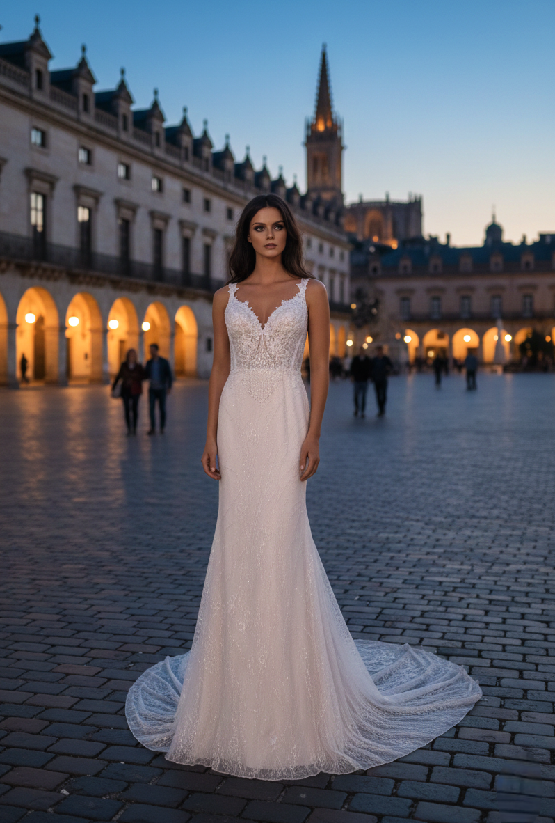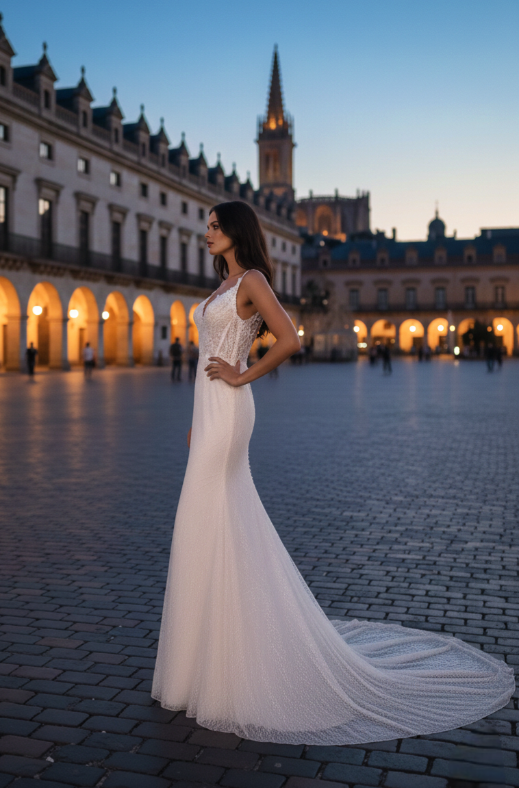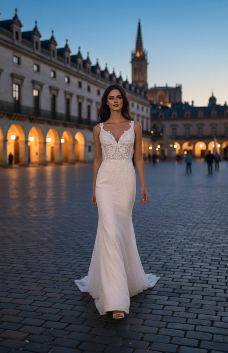 Ez a menyasszonyi ruha a modern csillogás és a kifinomult, alakot követő elegancia mintapéldája.