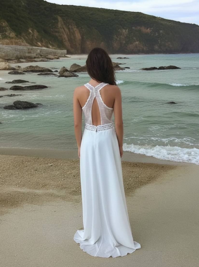 Felső része csipke díszítést kapott, mely alatt finoman átsejlik a bőr színe is. Hátul gyönyörű hátkivágással, gombokkal díszített megoldást kapott. Alsó része lágyan omlót tört fehér chiffon anyagból van, tökéletesen passzolva a letisztul felső részhez. Visszafogottan elegáns menyasszonyi ruha, melyben azért ott rejlik a Női erő és magabiztosság, az áttetsző felső részének, és kivágott hátának köszönhetően.