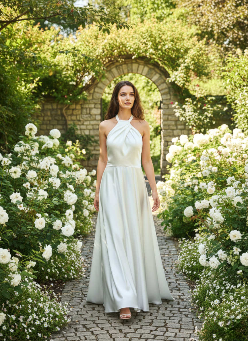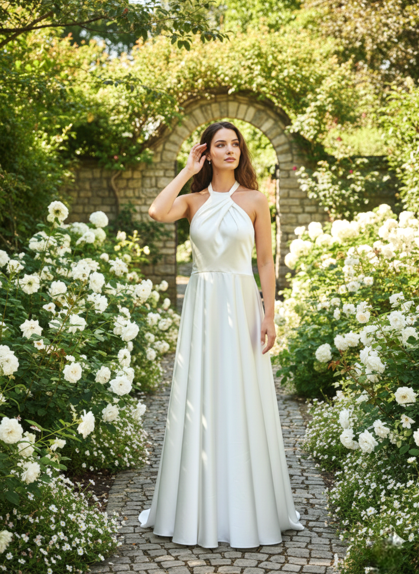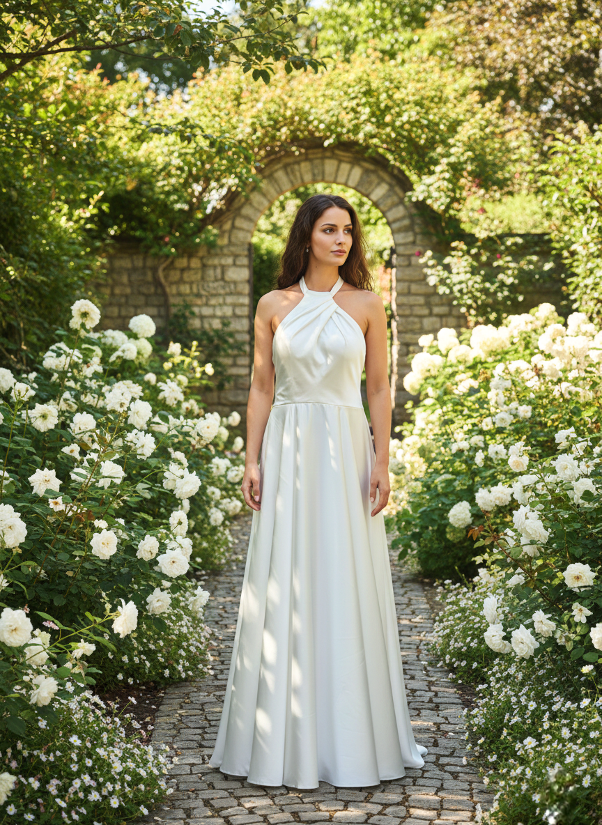 Halter-nyakú (nyakba akasztós) kialakítás: A ruha legkarakteresebb eleme a magasított nyakrész, amely szabadon hagyja a vállakat és a karokat.