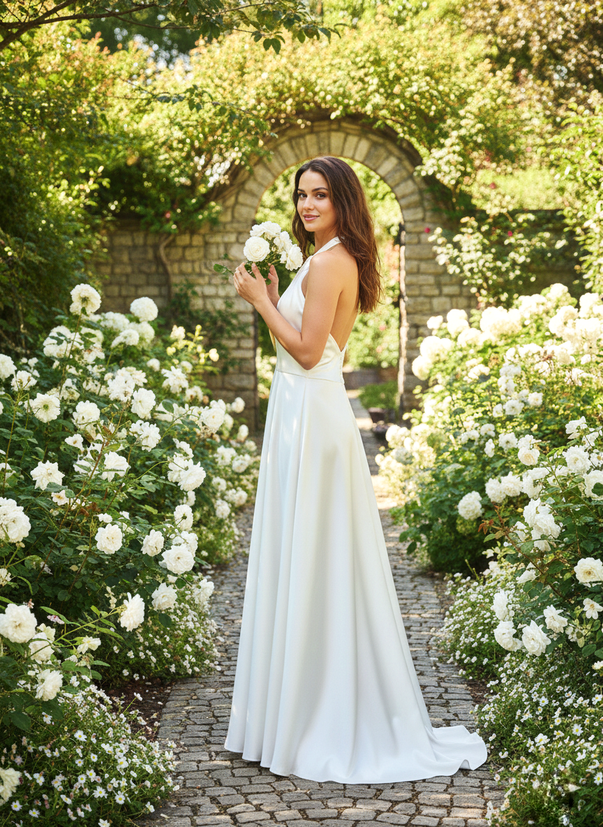 Ez a darab a „csendes luxus” képviselője: nem a csillogással, hanem a kifinomult szabással és a nemes anyaggal hódít. Tökéletes választás szabadtéri, kerti esküvőkhöz vagy olyan menyasszonyoknak, akik kerülik a túlzott díszítettséget.