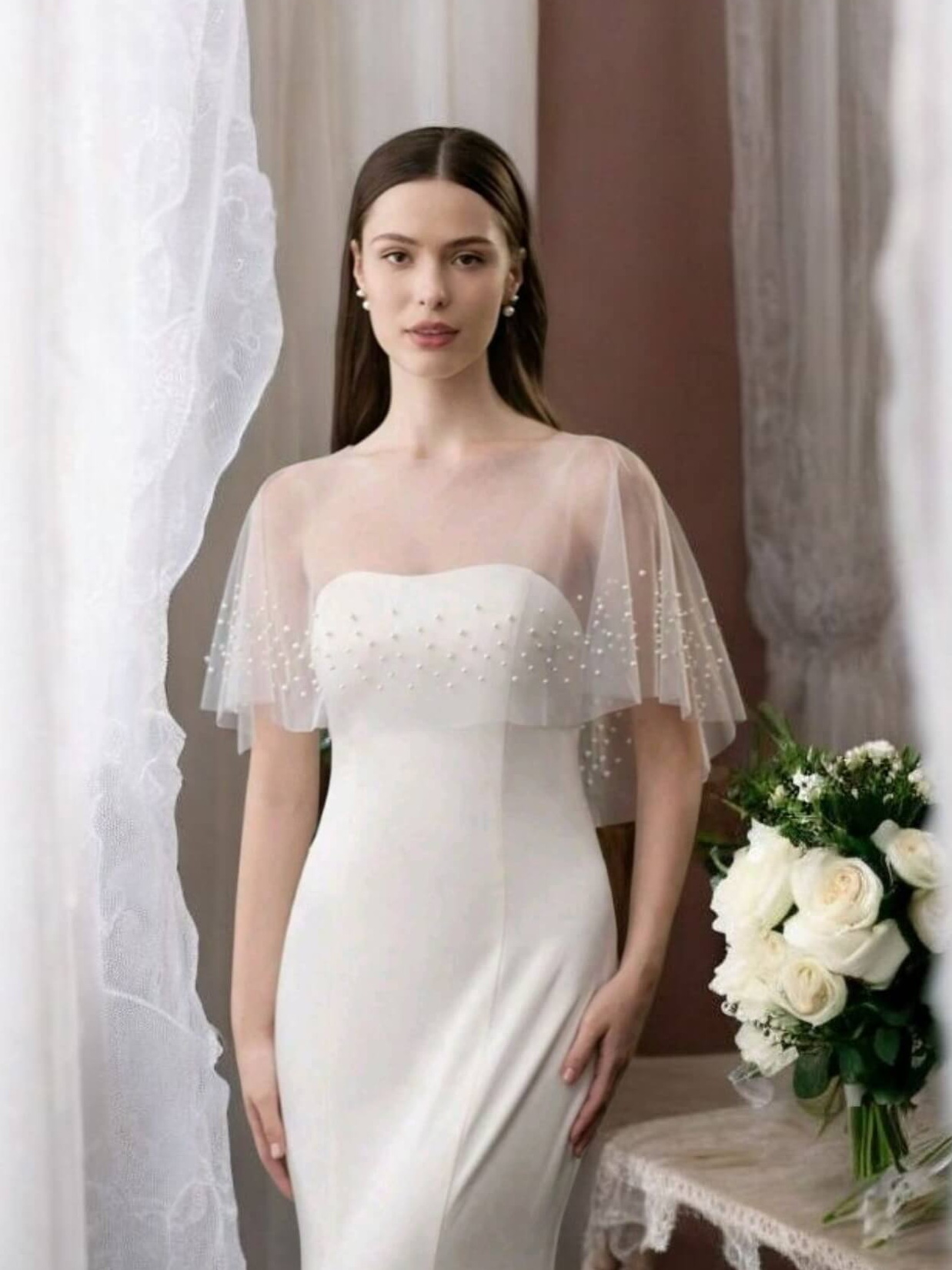 A gyöngyökkel díszített menyasszonyi pelerin egy elegáns kiegészítő, amely nemcsak esztétikai értéket képvisel, hanem praktikus funkcióval is bír, különösen hűvösebb időjárás esetén. Ez a vállra terített, tüllből készült rövid palást finom gyöngydíszítéssel teszi még különlegesebbé az esküvői megjelenést.