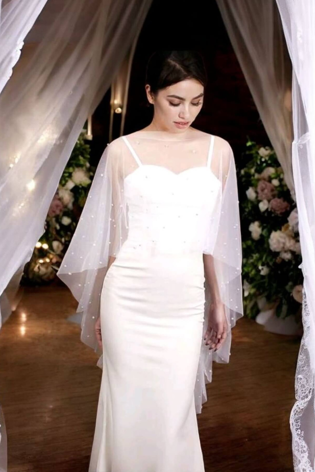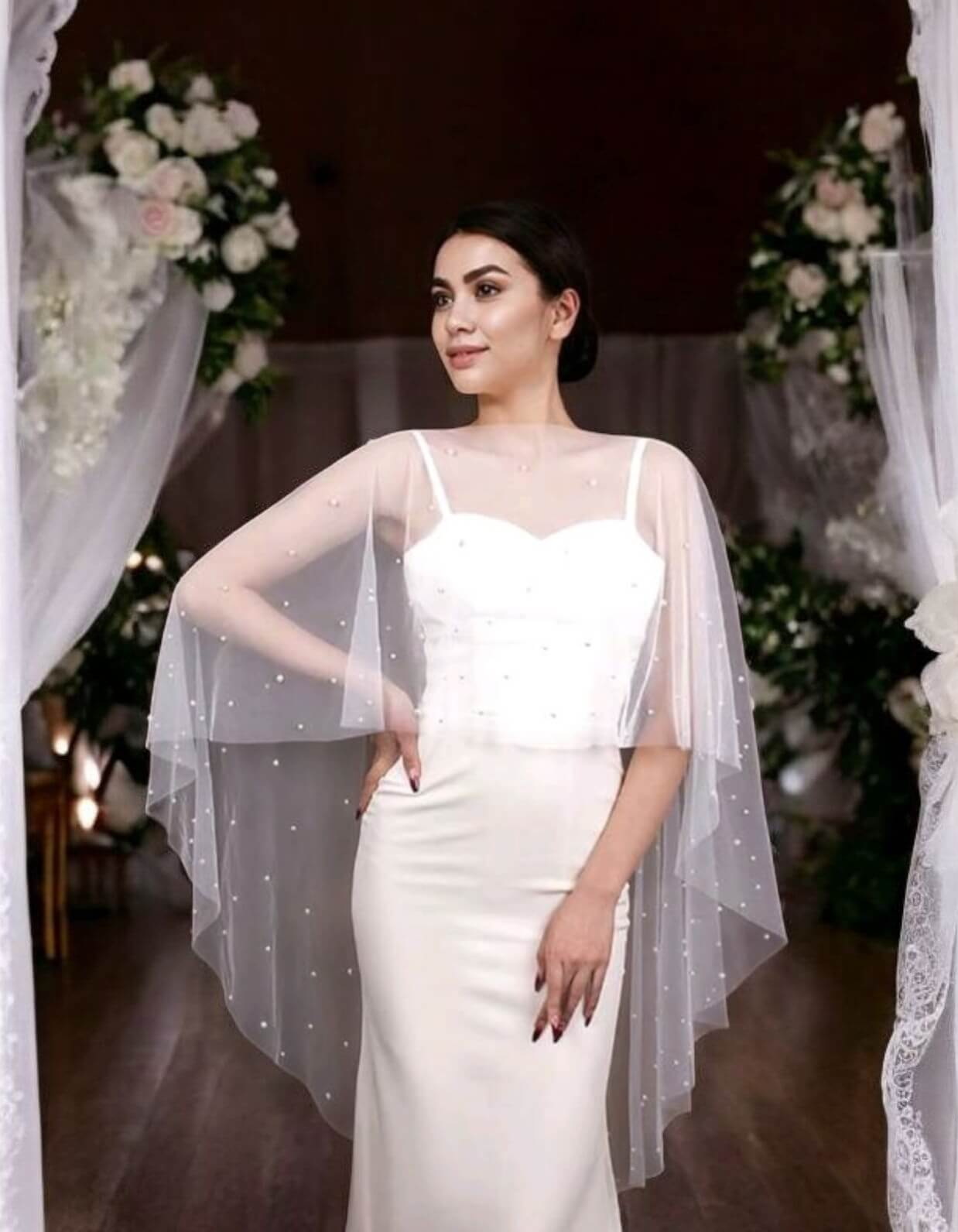 A gyöngyökkel díszített menyasszonyi pelerin egy elegáns kiegészítő, amely nemcsak esztétikai értéket képvisel, hanem praktikus funkcióval is bír, különösen hűvösebb időjárás esetén. Ez a vállra terített, tüllből készült rövid palást finom gyöngydíszítéssel teszi még különlegesebbé az esküvői megjelenést.