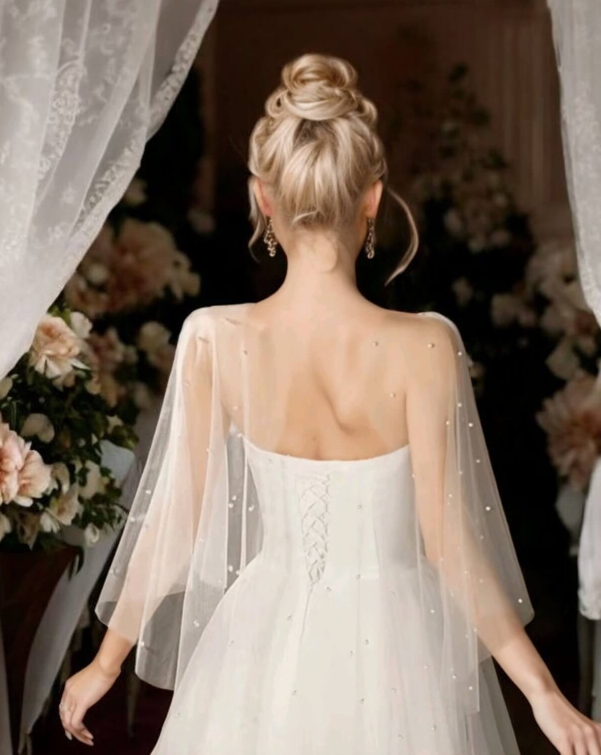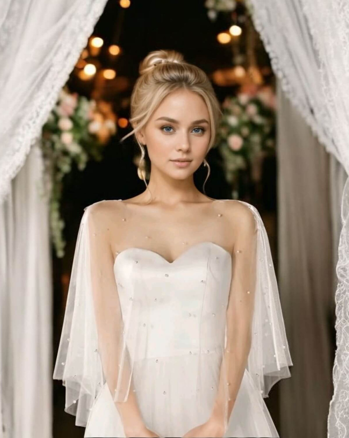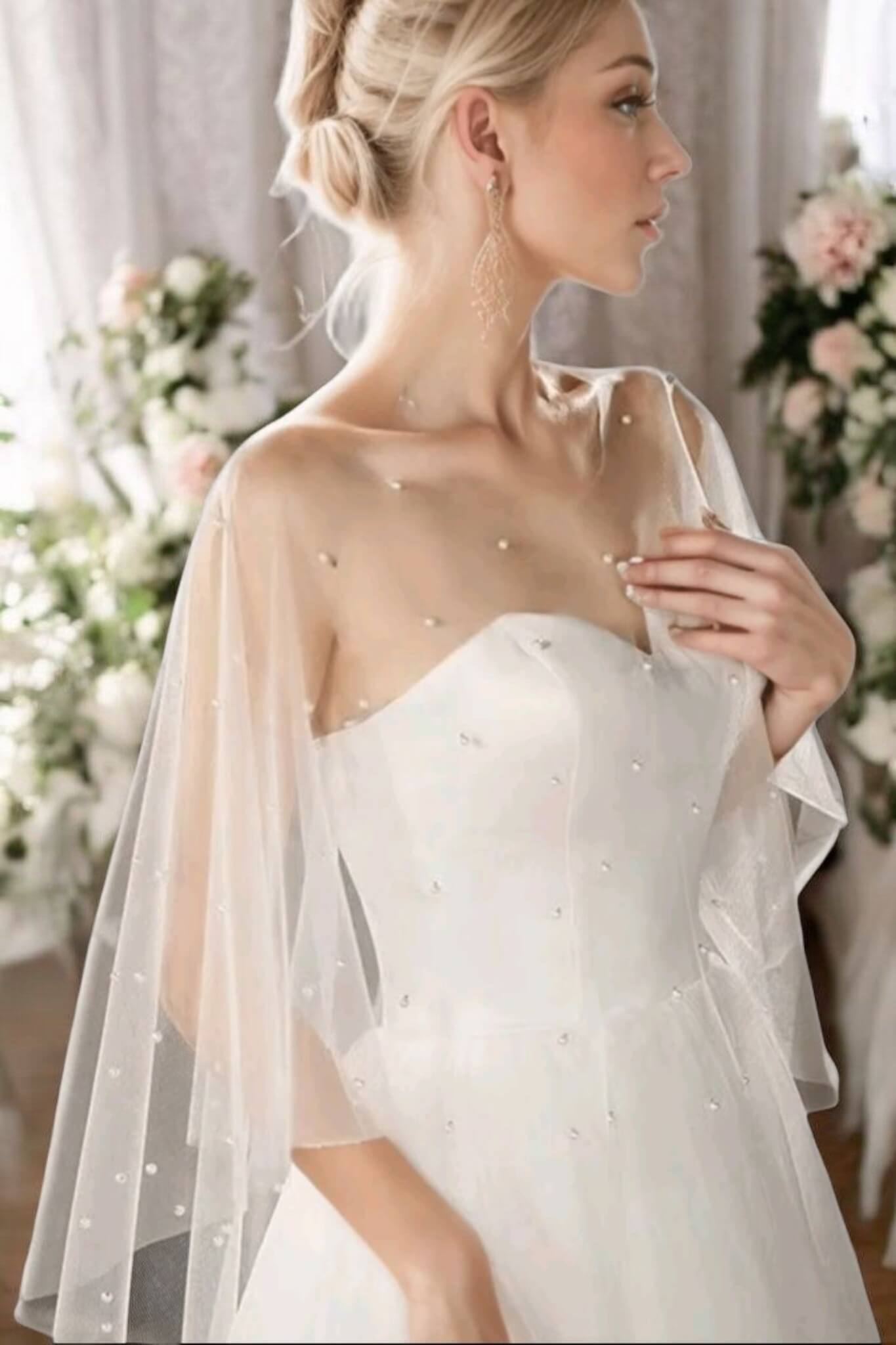 A gyöngyökkel díszített menyasszonyi pelerin egy elegáns kiegészítő, amely nemcsak esztétikai értéket képvisel, hanem praktikus funkcióval is bír, különösen hűvösebb időjárás esetén. Ez a vállra terített, tüllből készült rövid palást finom gyöngydíszítéssel teszi még különlegesebbé az esküvői megjelenést.