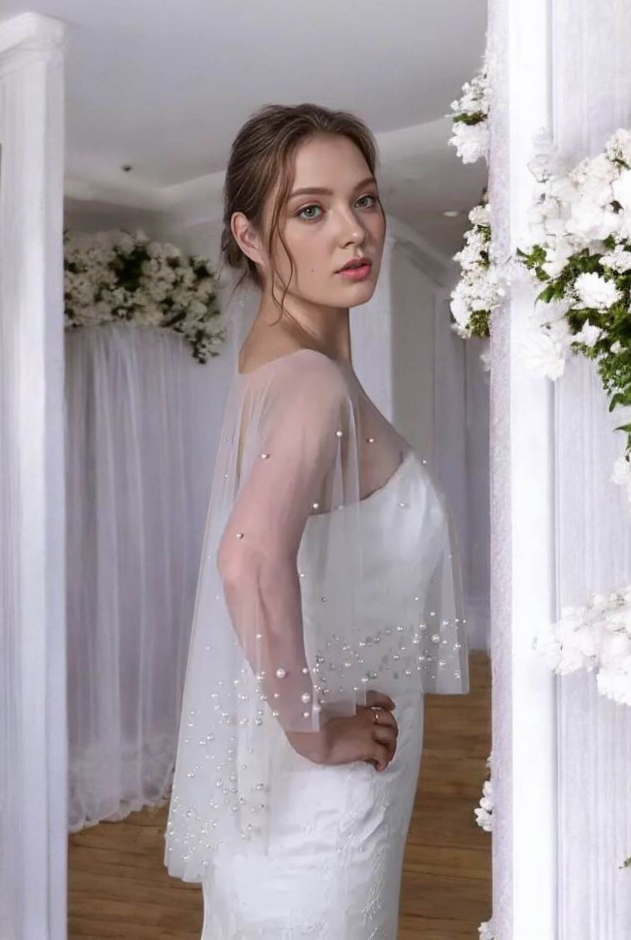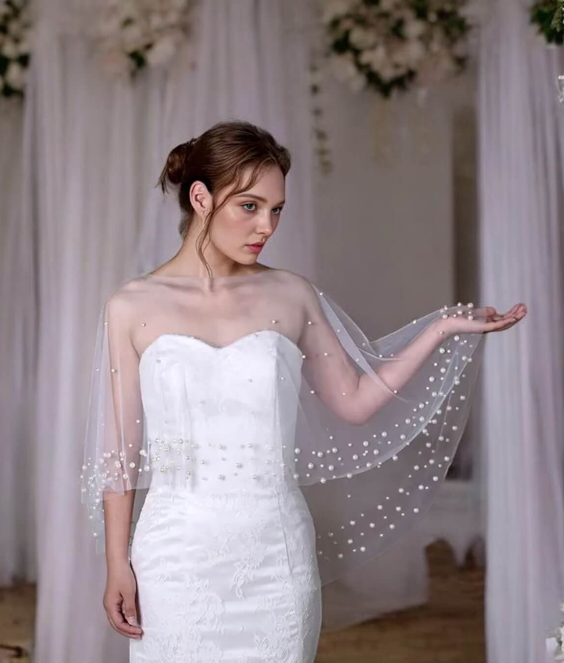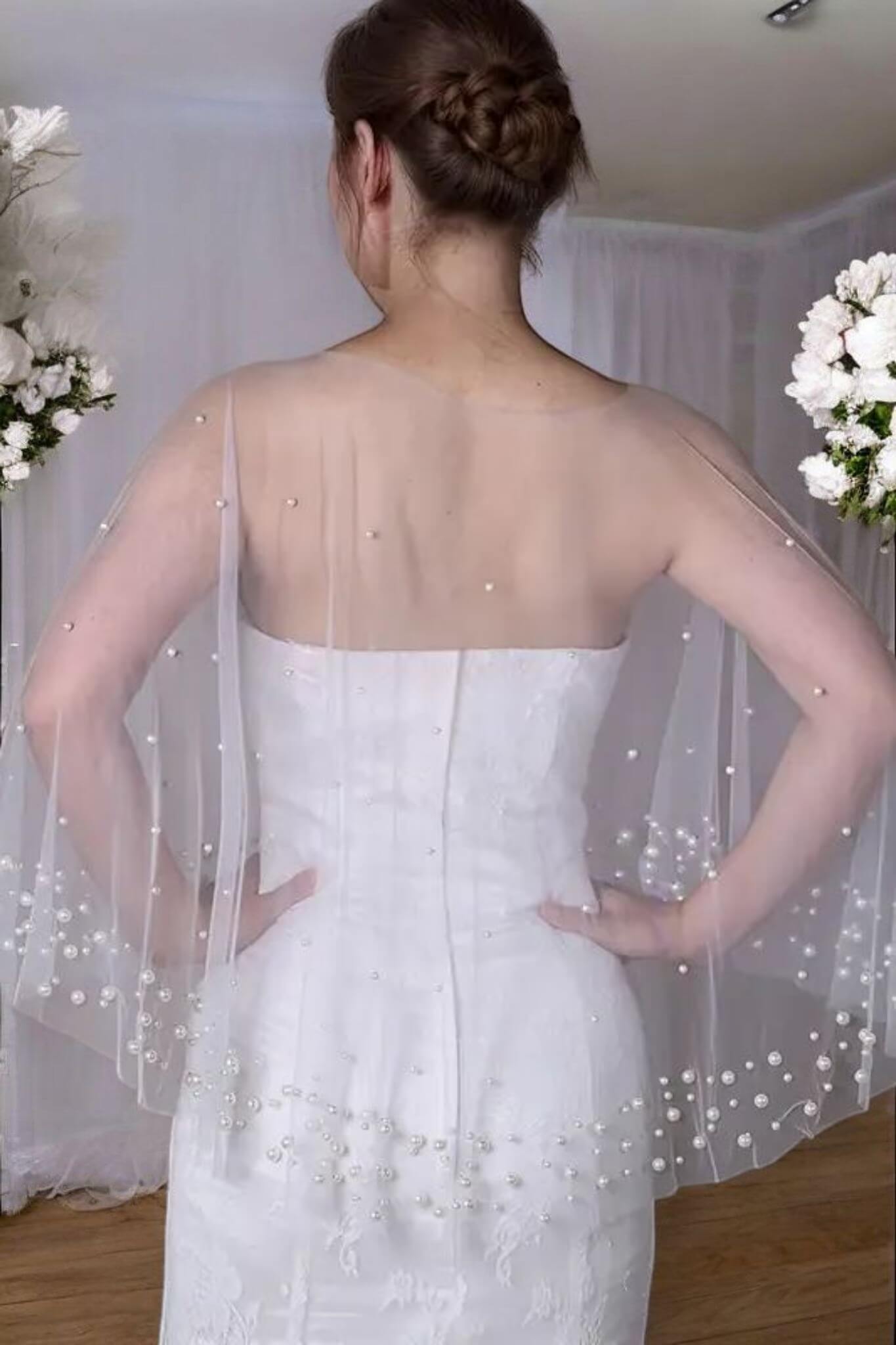 A gyöngyökkel díszített menyasszonyi pelerin egy elegáns kiegészítő, amely nemcsak esztétikai értéket képvisel, hanem praktikus funkcióval is bír, különösen hűvösebb időjárás esetén. Ez a vállra terített, tüllből készült rövid palást finom gyöngydíszítéssel teszi még különlegesebbé az esküvői megjelenést.