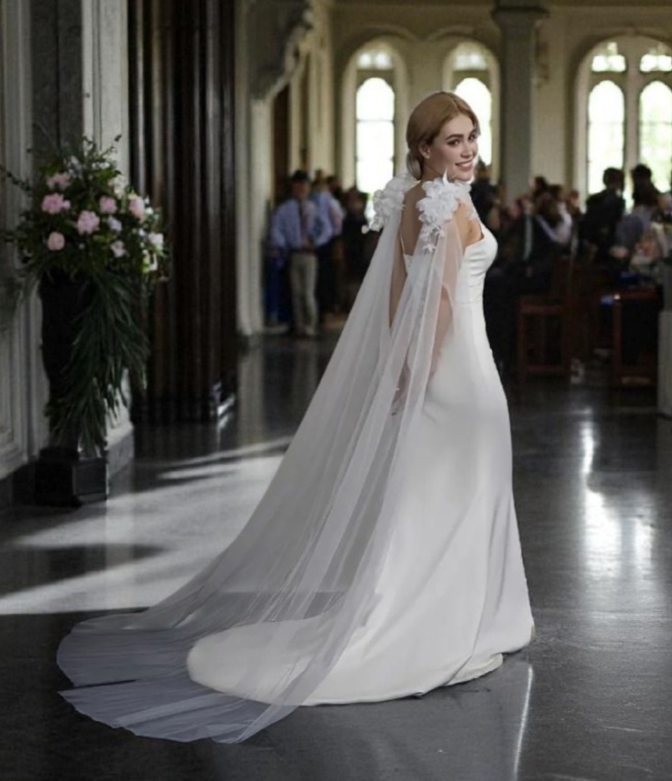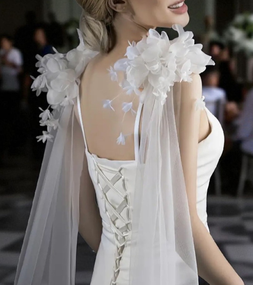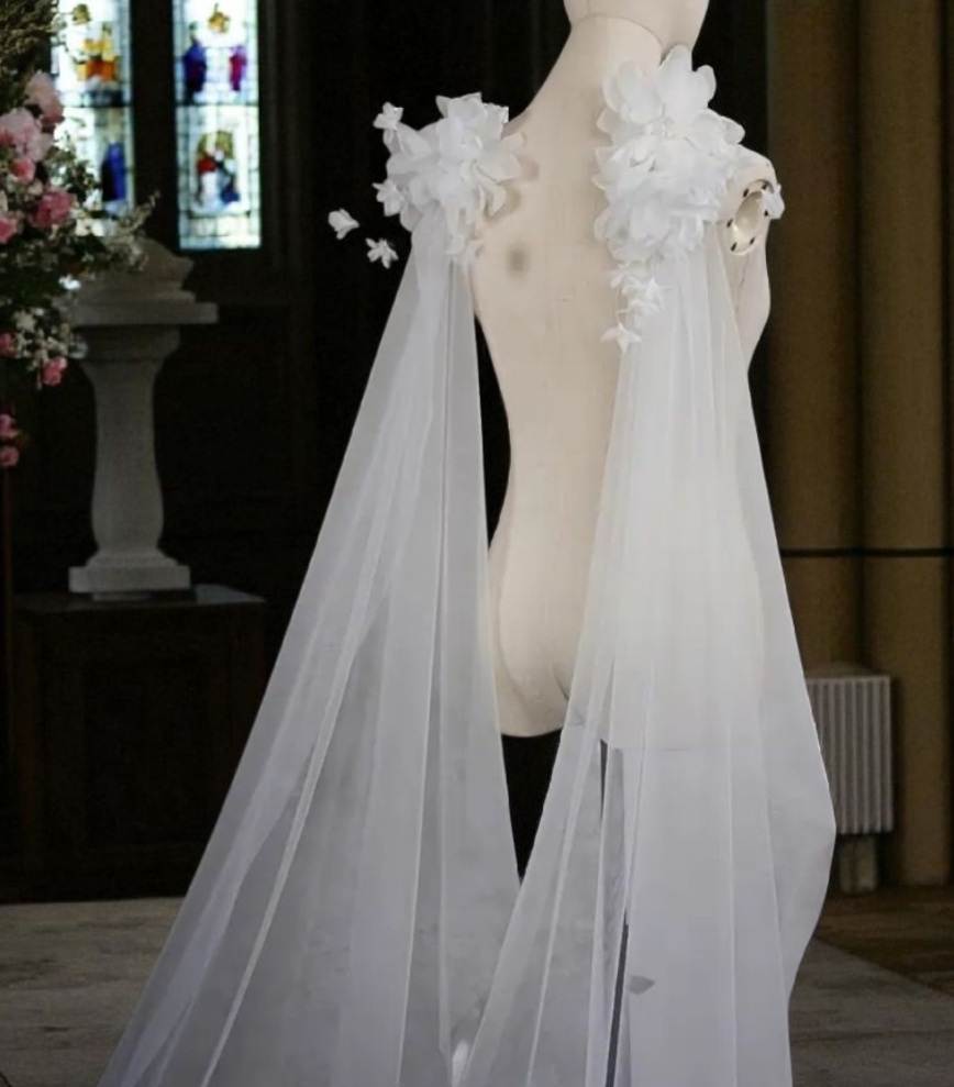 Hosszú fehér vállra csatolós menyasszonyi stóla, amely finom, áttetsző anyagból készült, és 3d virágokkal díszített. A stóla vállról omlik alá, virágokkal elszórva, amelyek még romantikusabbá és kifinomultabbá teszik az összképet. Ez a stóla remek választás, ha valaki egy könnyed, mégis különleges kiegészítőt szeretne a menyasszonyi ruhájához.