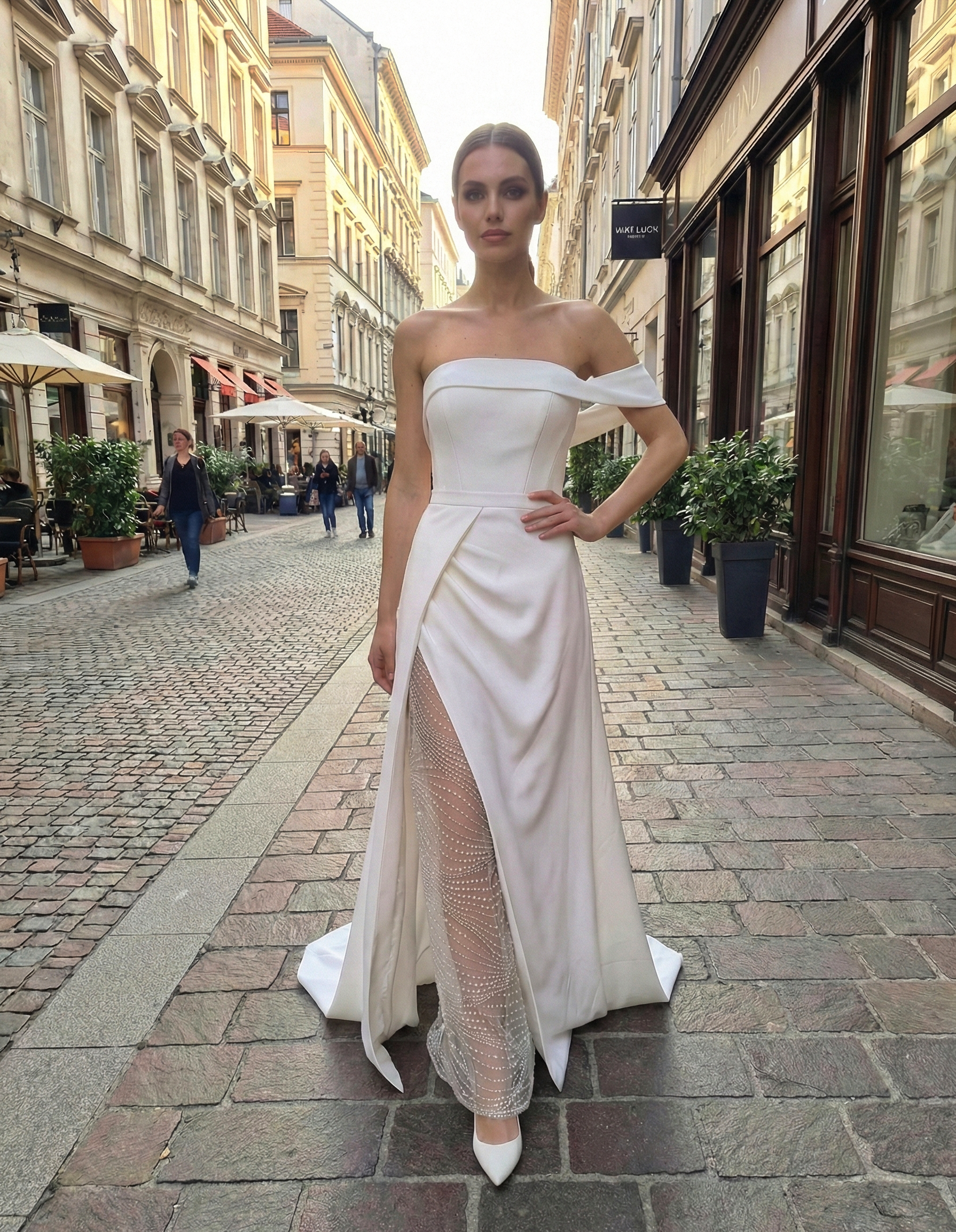 Összefoglalva: Egy letisztult vonalvezetésű, de merész és modern, extravagáns elemekkel (magas slicc és csillogó belső szoknya) ellátott esküvői kreáció.