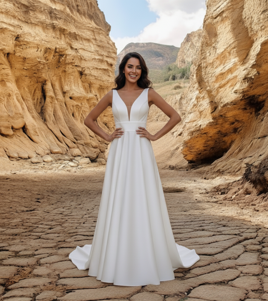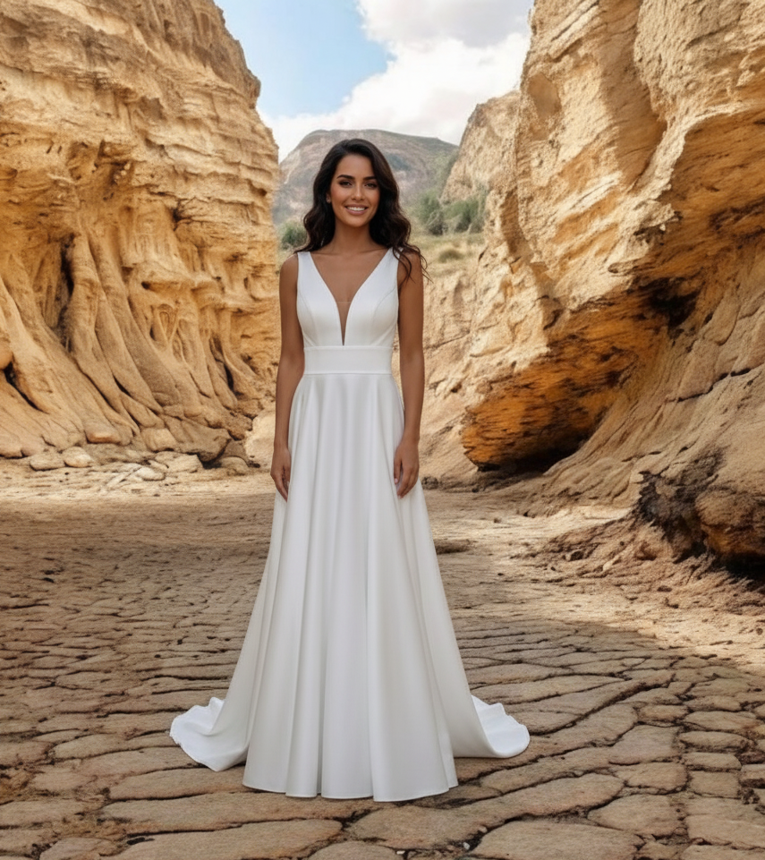 Összességében egy elegáns, letisztult, mélyen dekoltált, szatén (vagy hasonló anyagú) A-vonalú menyasszonyi ruha.