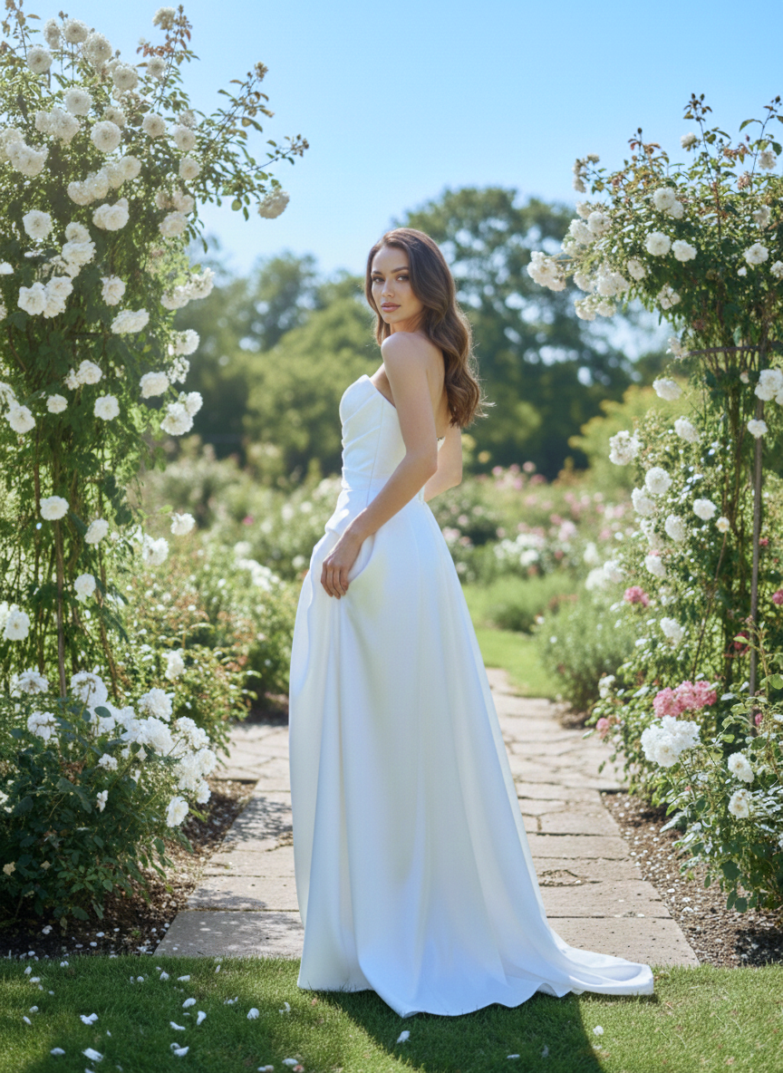 A ruha a modern glamour stílust képviseli. Mivel nincsenek rajta csipkék vagy kövek, a hangsúly tisztán a kifinomult szabásvonalakon és az anyag minőségén van. Kiváló választás egy elegáns kerti esküvőhöz vagy egy elegáns, minimál stílusú szertartáshoz.