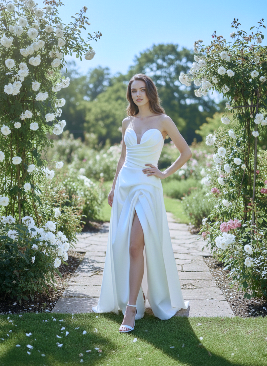Drapéria: A szoknya bal oldalán egy hangsúlyos, csomózott hatású redőzés található, amelyből a ruha anyaga vízesésszerűen omlik le.