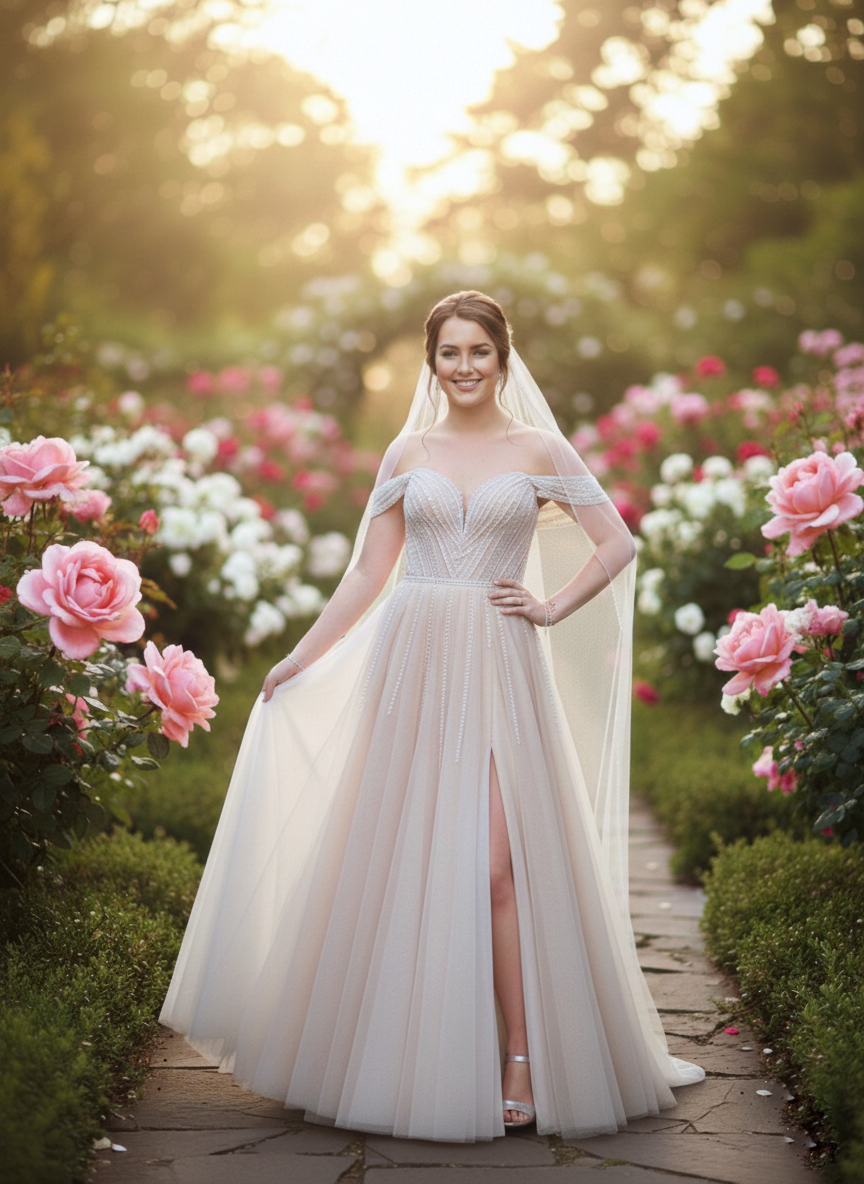 Ez a ruha tökéletes választás egy romantikus szabadtéri esküvőhöz. Egyszerre sugároz királyi eleganciát a tüll és a csillogó díszítés révén, miközben a hasíték és a vállat szabadon hagyó pántok frissé és moderné teszik.
