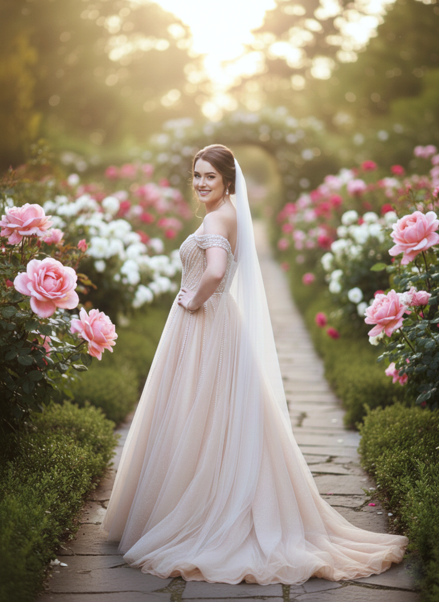 Nude árnyalatú csillámló tüll menyasszonyi ruha. A modern romantika jegyében készült, ötvözve a klasszikus hercegnős fazont a kortárs, csillogó részletekkel.