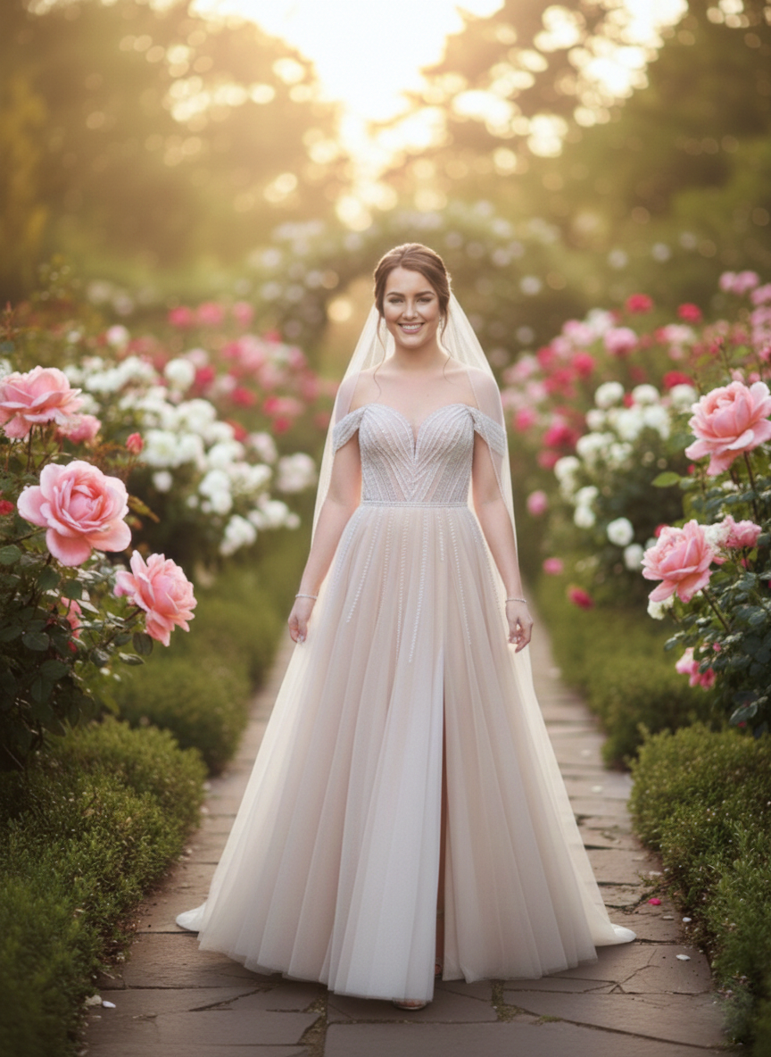 Szín: A ruha nem hófehér, hanem egy melegebb, nude árnyalatban pompázik, ami lágyítja az összhatás