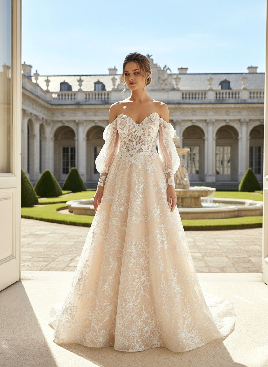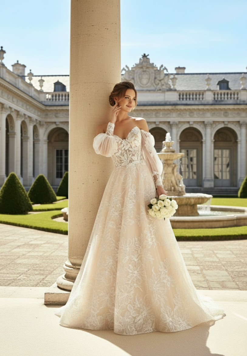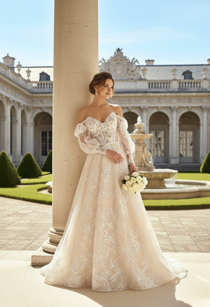 Puffos, levehető áttetsző ujjak: A legkülönlegesebb elem a tüllből készült, bő, lágy esésű ujjak, amelyeket a csuklónál hímzett csipkeszegély zár le.