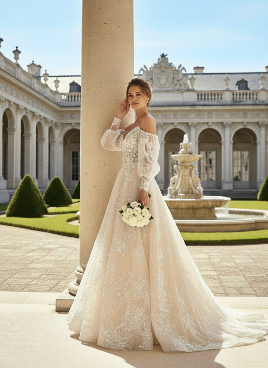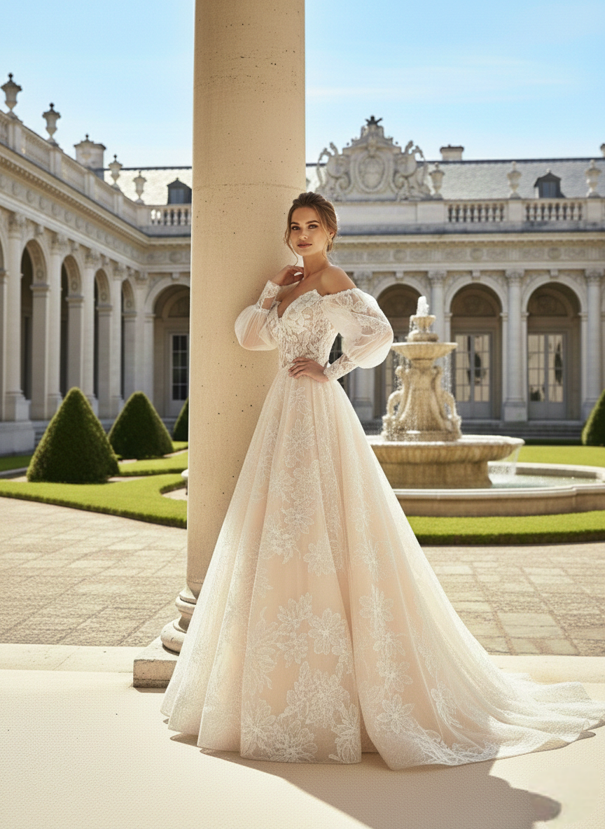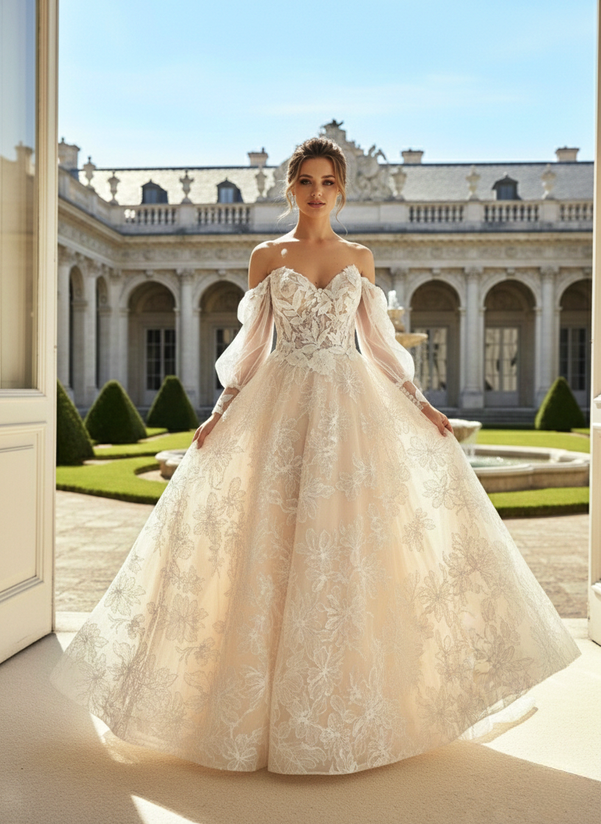 Ez a menyasszonyi ruha a romantikus elegancia és a barokk pompa találkozása.