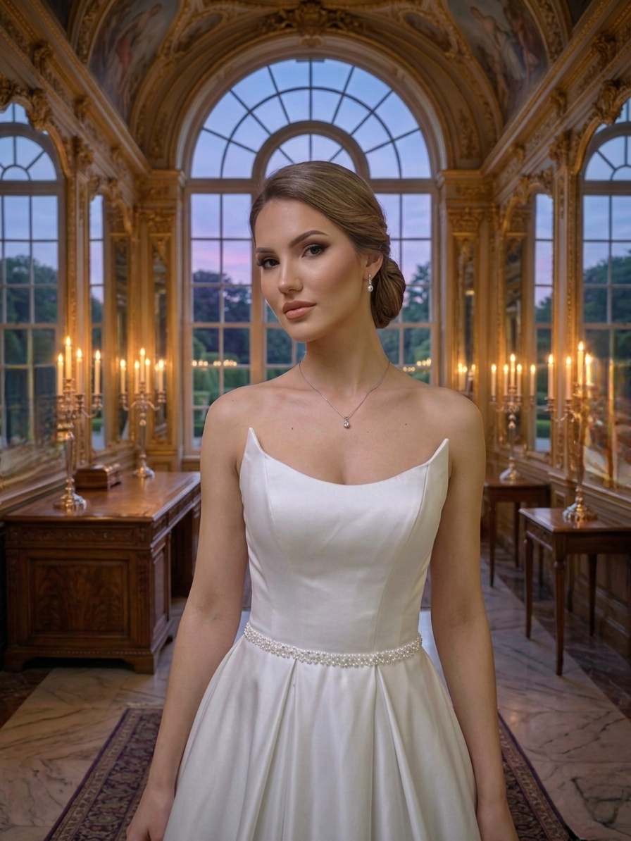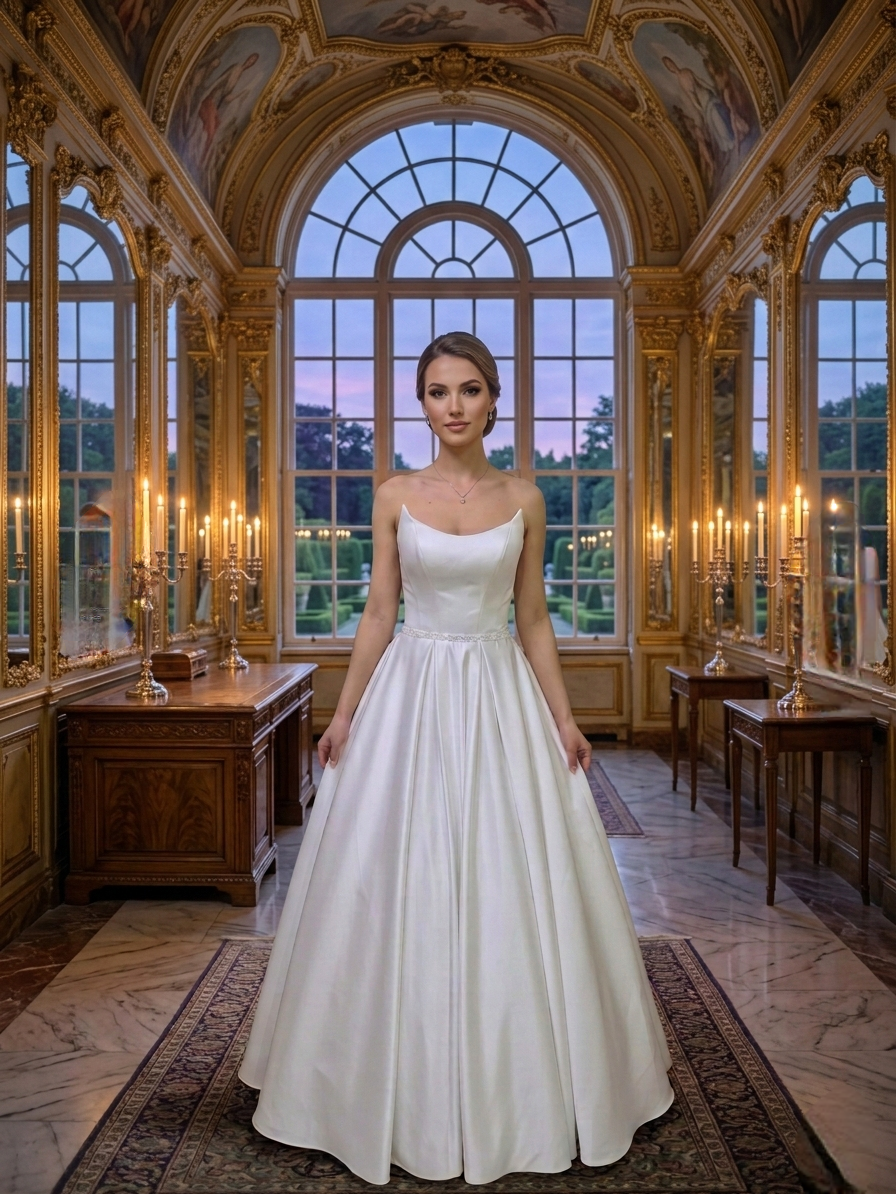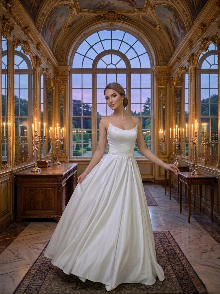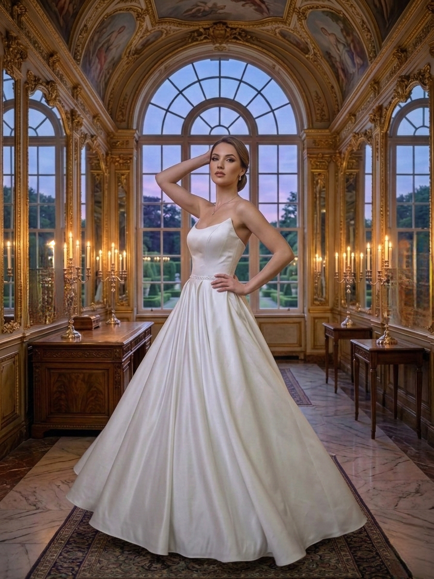 Anyag: Itt is a nehezebb esésű, prémium mikádó selyem és fényes szatén dominál, amely tökéletesen tartja a ruha szoborszerű formáját.