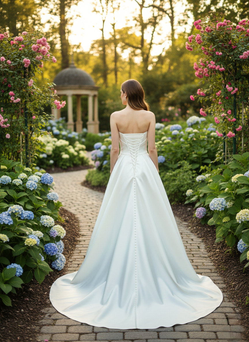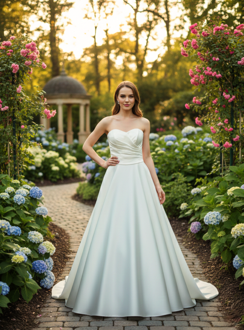 Szatén : A ruha anyaga sűrű szövésű, matt fényű és súlyos esésű, ami királyi megjelenést biztosít.