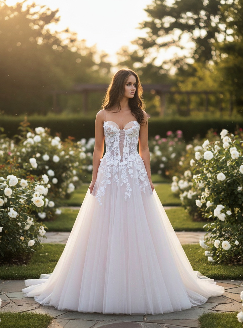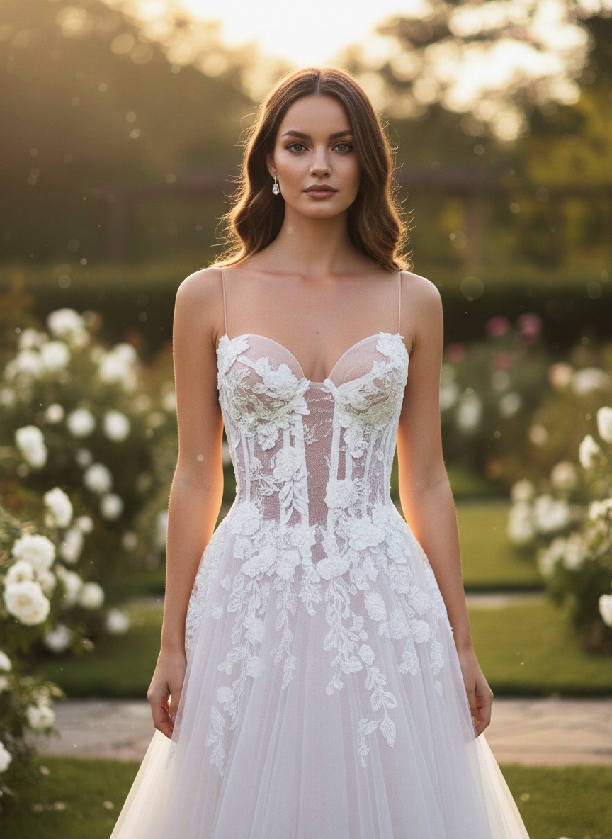 Díszítés: Gazdagon díszített csipke rátétekkel és virágmotívumokkal, amelyek néhol áttetsző (illúzió) hálós anyagon helyezkednek el.